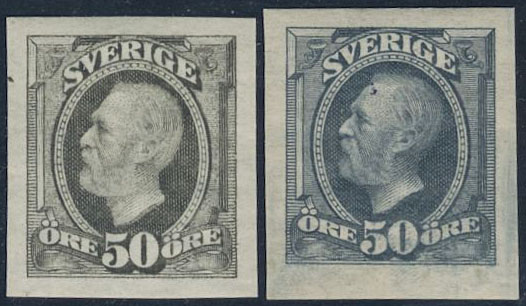 Sweden. Facit 59v1 ★, 1891 Oscar II 50 öre grey, imperf variety in two different shades, very light hinged and light hinged.