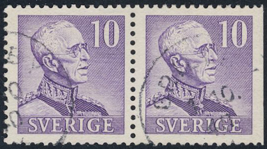 Sweden. Facit 273CBb used, 1939 Gustaf V large numerals 10 öre pair perf 4+3. Unusually wide margin. SEK 2200