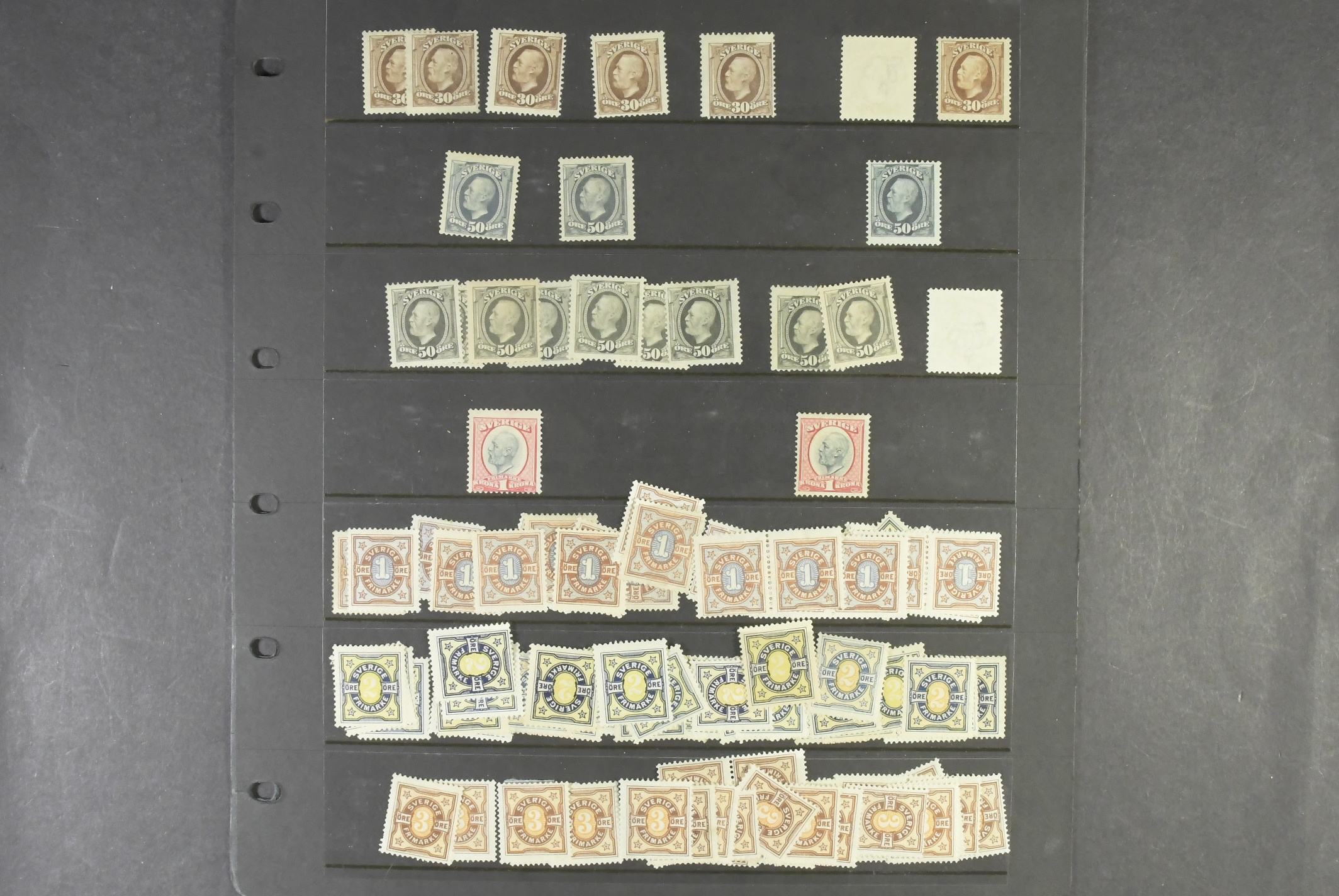 Sweden. Accumulation mostly ★ 1892–1920 on visir leaves. Duplicate stock with Oscar II, Medallion, Landstorm and Air mail overprints 1920. Incl. many shades, watermark varities and much more. Very high catalogue value. Please see a selection of scans at www.philea.se. Somewhat mixed quality. (300+)