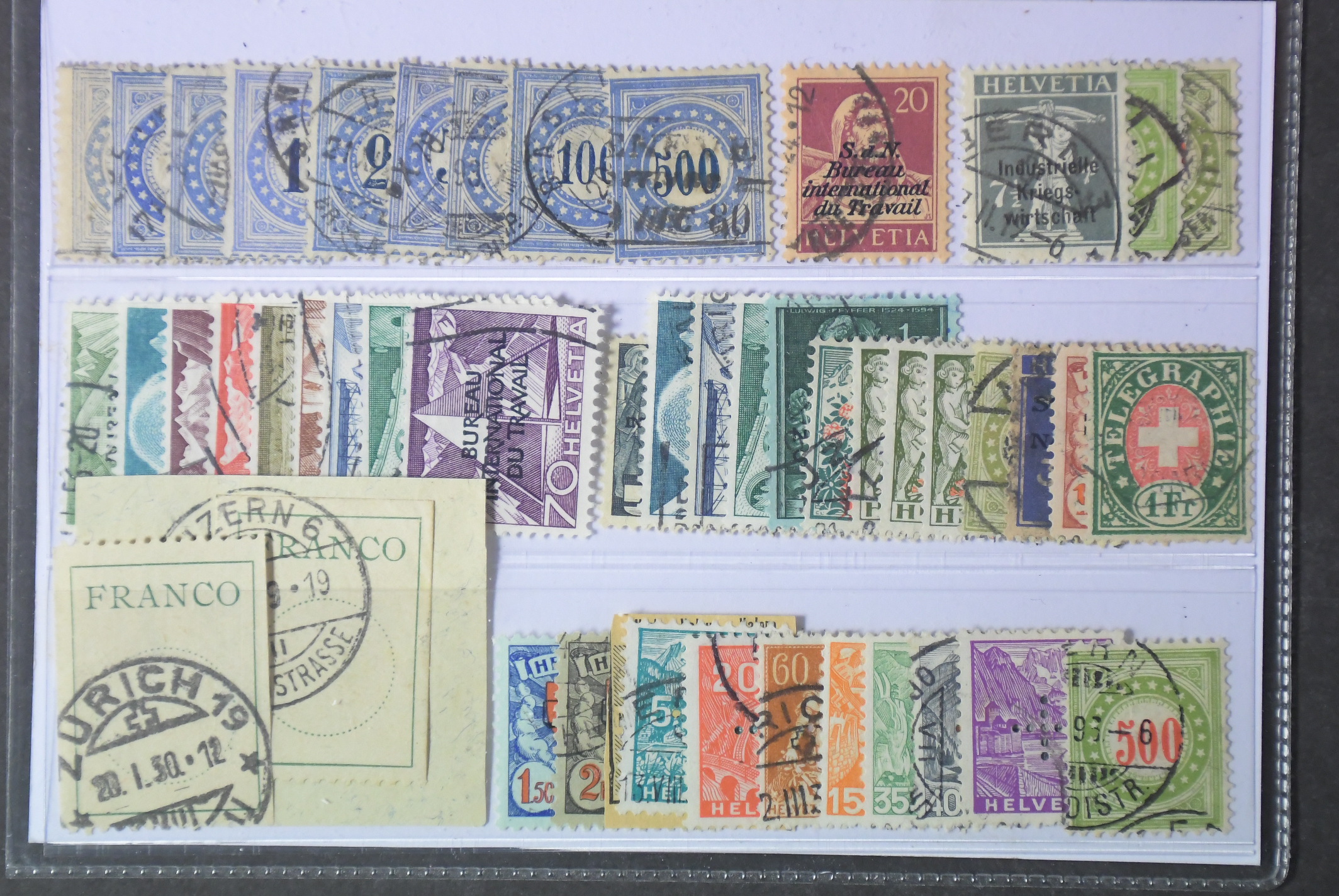 Switzerland. Used 1910–1950. Back of the book. All different, e.g. postage due 1–9, BIT 3, 84–90, 92–93, Ind 3 II, 'Franco-Zettel' II, IV. Mostly good quality. Mi € 610 (47)