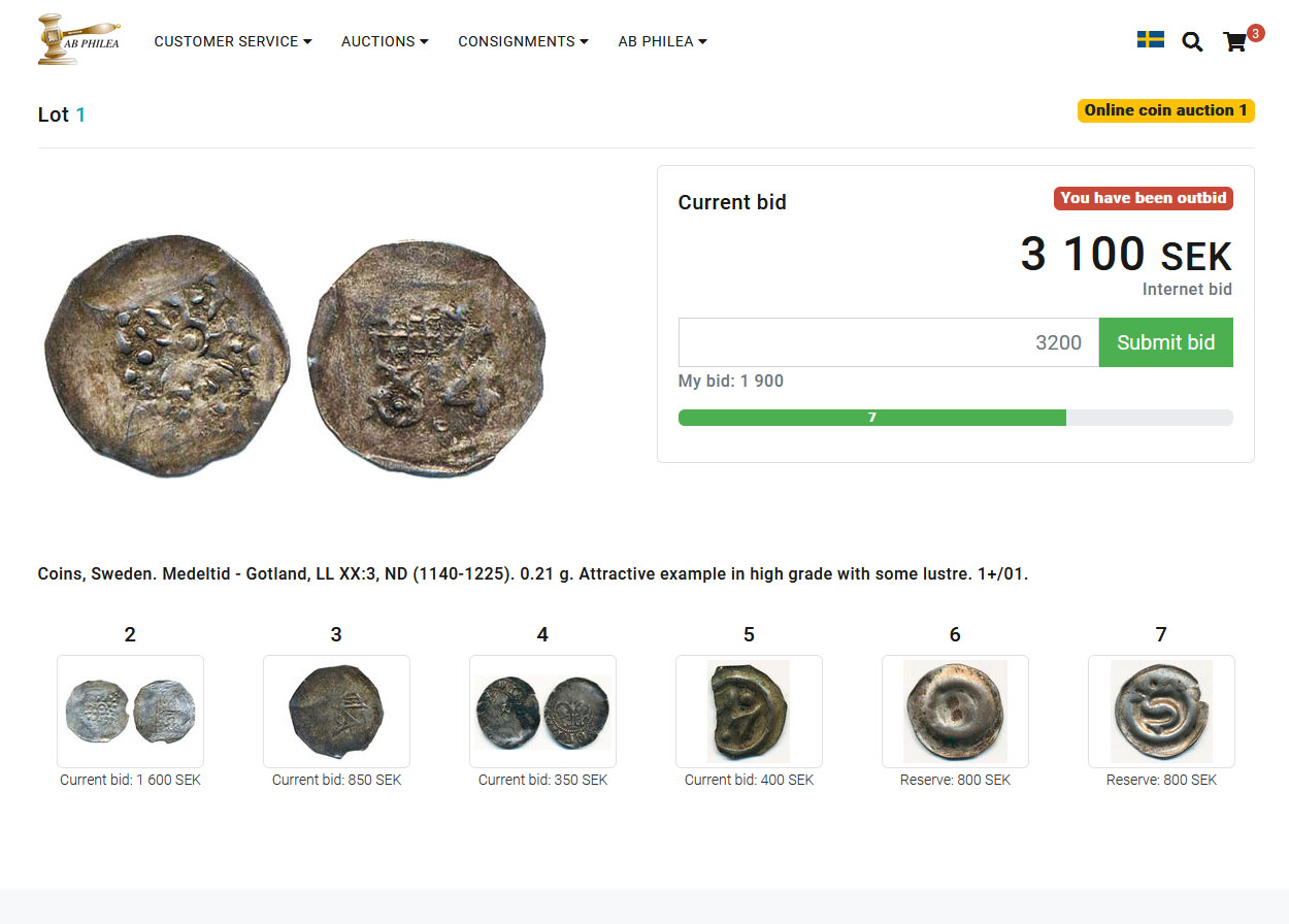 Here the auction is in progress, and the view is updated for each new bid. If you want to bid, click on "Place bid". The auction system displays the next valid bid, but you can also enter a higher amount if you know that you want to continue until a certain amount. The website uses your amount as a maximum amount, and raises your bid with one increment at a time until you have won the lot or been outbid.