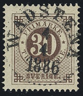 Sweden. Facit 35h used, 30 öre black-brown on soft paper. EXCELLENT cancellation WADSTENA 4.4.1886.