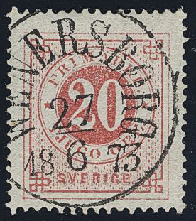 Sweden. Facit 22c used, 20 öre red-light red. Superb cancellation WENERSBORG 27.6.1873.