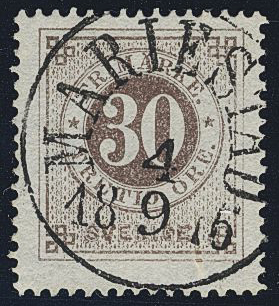 Sweden. Facit 25h used, 30 öre greyish brown. EXCELLENT cancellation MARIESTAD 4.9.1876. Very small pre-printing paper fold ("dragspel").