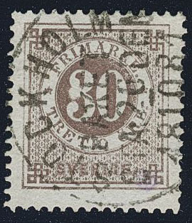 Sweden. Facit 35v12 used, 30 öre brown, white flaw in “3” = “80” variety. Beautiful copy cancelled STOCKHOLM PAKET STADEN 26.10.1881. A few worn perfs.