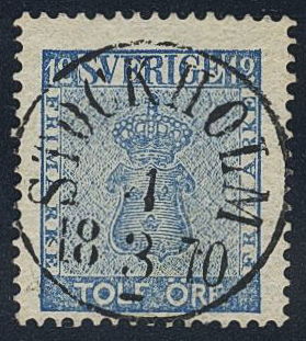 Sweden. Facit 9d3 used, 12 öre light blue, perforation of 1865. EXCELLENT cancellation STOCKHOLM 4.3.1870.