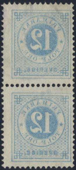 Sweden. Facit 32v3 used, 12 öre blue, set-off variety in pair. Cancelled GÖTEBORG 25.2.1884. Unusually clear.