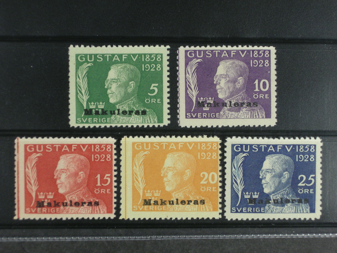 Sweden. Facit 226–30v (★), 1928 70th Birthday of King Gustaf V SET overprinted “MAKULERAS”. No gum (5). SEK 800