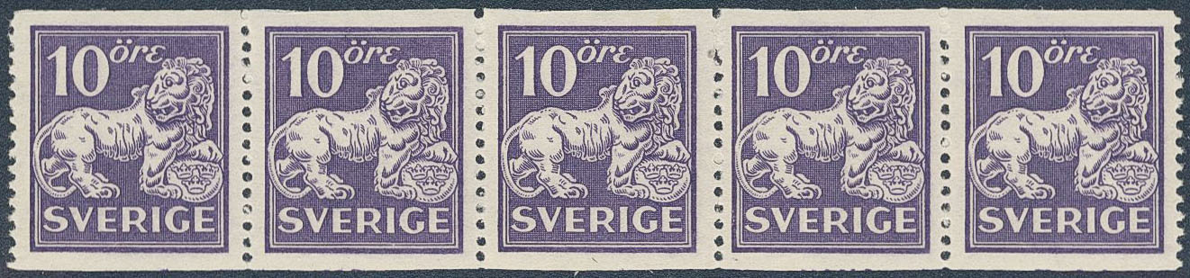 Sweden. Facit 145Ecxz ★★, 10 öre violet, type I, perf 13 with watermark lines + KPV in superb–EXCELLENT strip of five. Signed BG.