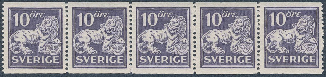 Sweden. Facit 145E ★★, 10 öre ultramarinish violet, type I, perf 13, A2-paper without wmk in strip of five. Superb. SEK 2000