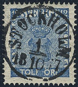 Sweden. Facit 9c3 used, 12 öre blue, perforation of 1865. EXCELLENT cancellation STOCKHOLM 1.10.1867.