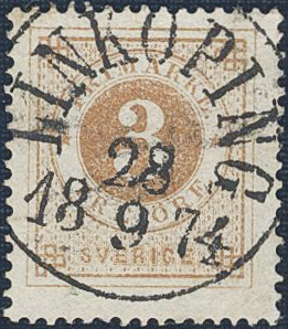 Sweden. Facit 17e used, 3 öre orange-brown. EXCELLENT cancellation LINKÖPING 28.9.1874.