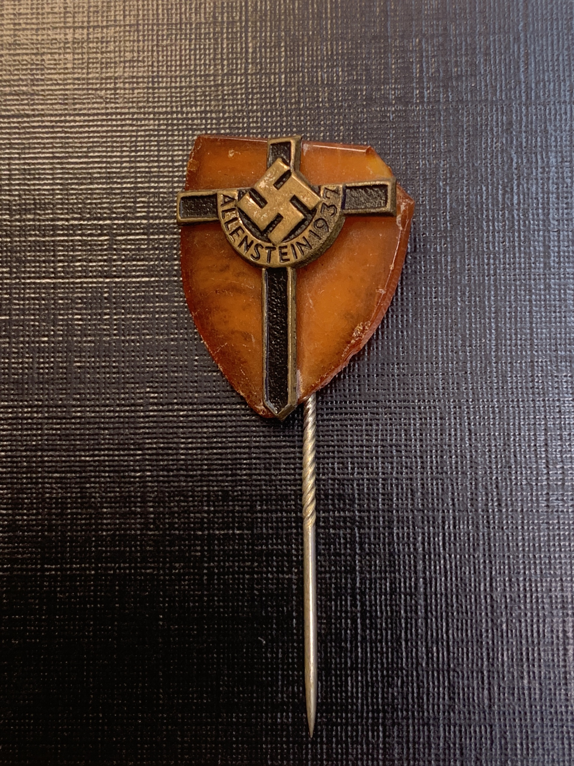 Antiques - Miscellaneous, Germany, Reich. NSD pin (Kreutz) with text "ALLENSTEIN 1937". Corner damage.