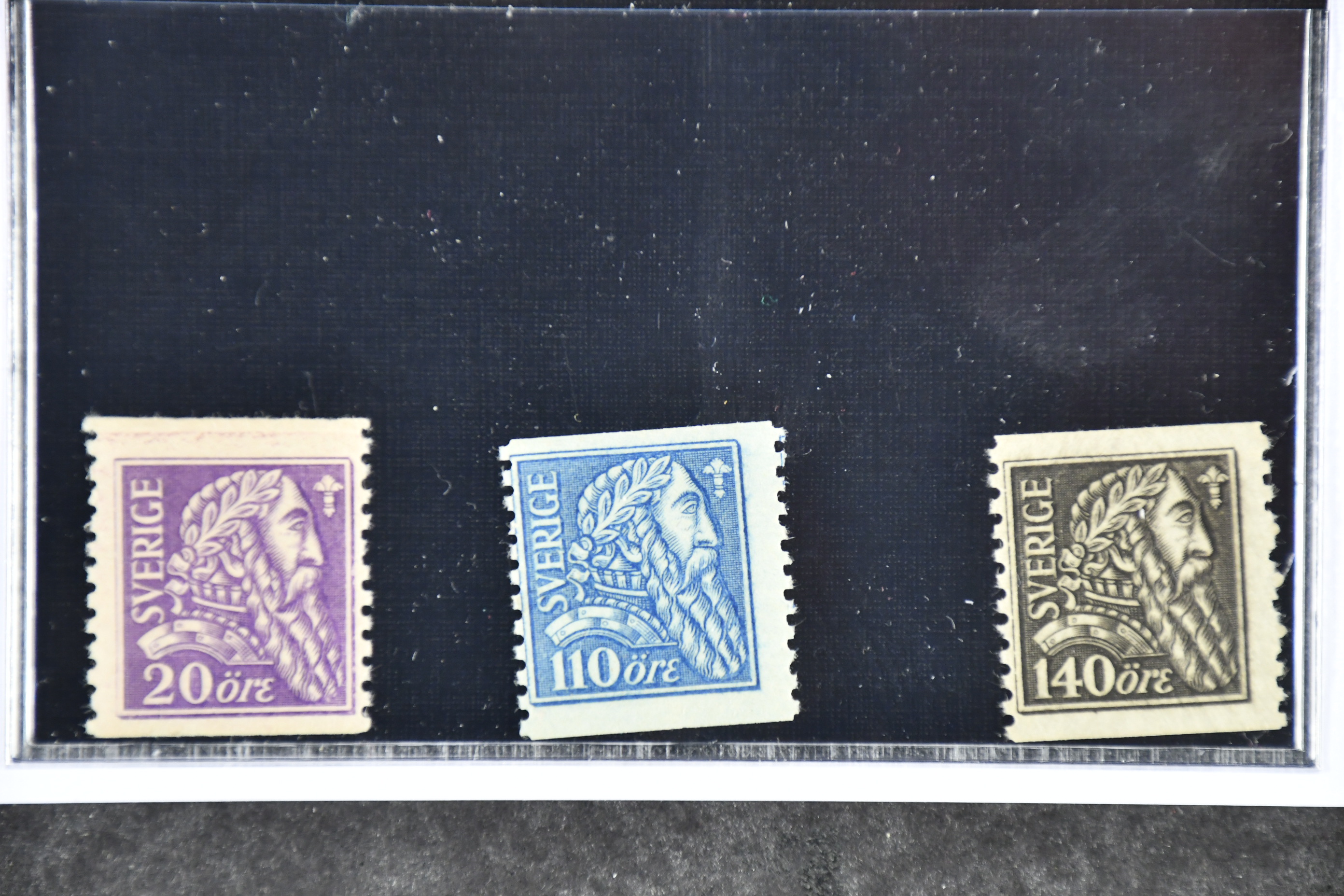 Sweden. Facit 153–55 ★★, 1921 Gustaf Vasa SET (3). 20 öre with interesting colour imprint in top, 140 öre with small part of KPV wmk. SEK 2650