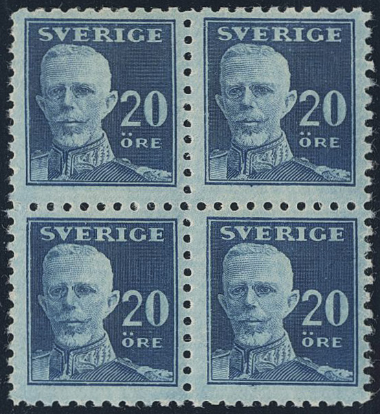 Sweden. Facit 151C ★★, 1920 Gustaf V full face 20 öre blue perf 9¾ on four sides. Block of four. SEK 2800