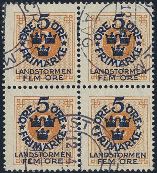 Sweden. Facit 105cx used, 1916 Landstorm I 5+FEM / 2 öre orange, inverted wmk lines, in block of four. Cancelled STOCKHOLM 1 AVG 12.4.17. SEK 3200
