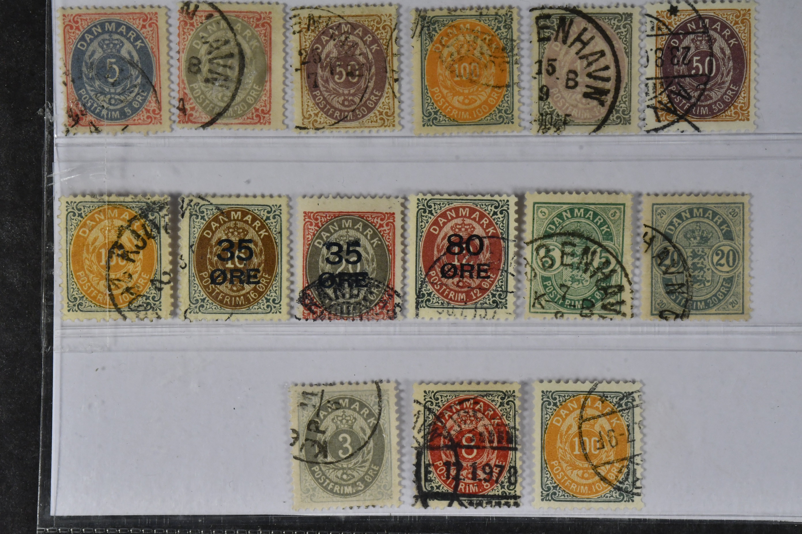 Denmark. Used 1875–1915. All different, e.g. F 30, 34, 36-37, 41vm, 44, 45vm, 47-50, 52. Mostly good quality. F SEK 7010 (15)