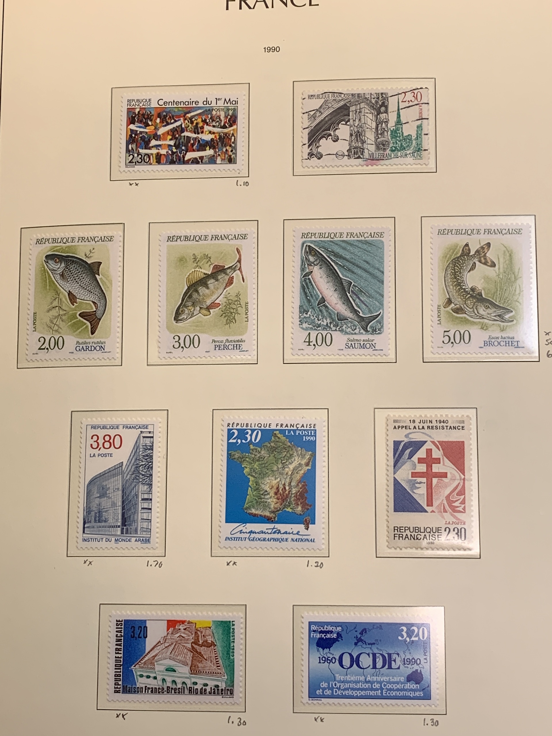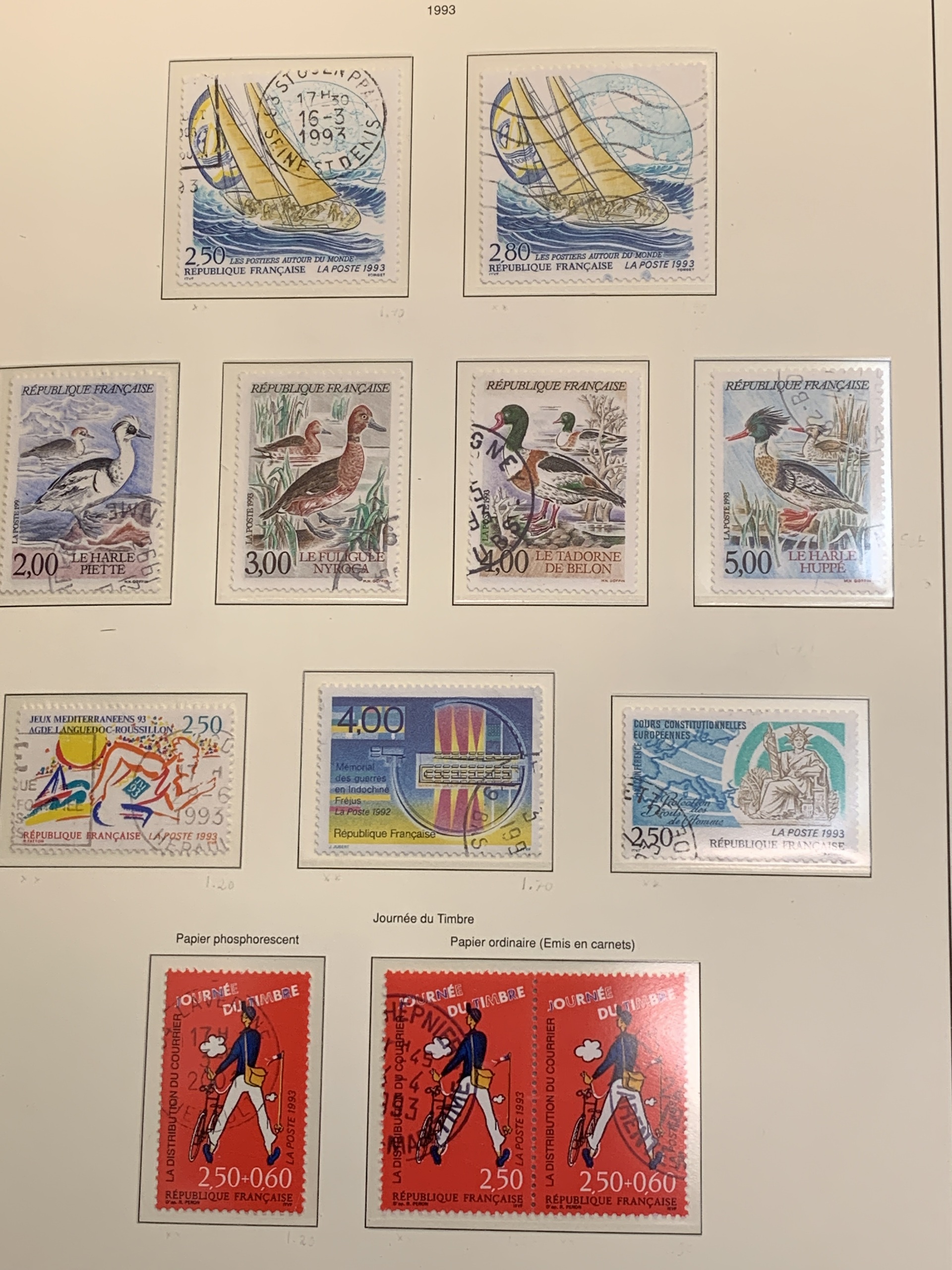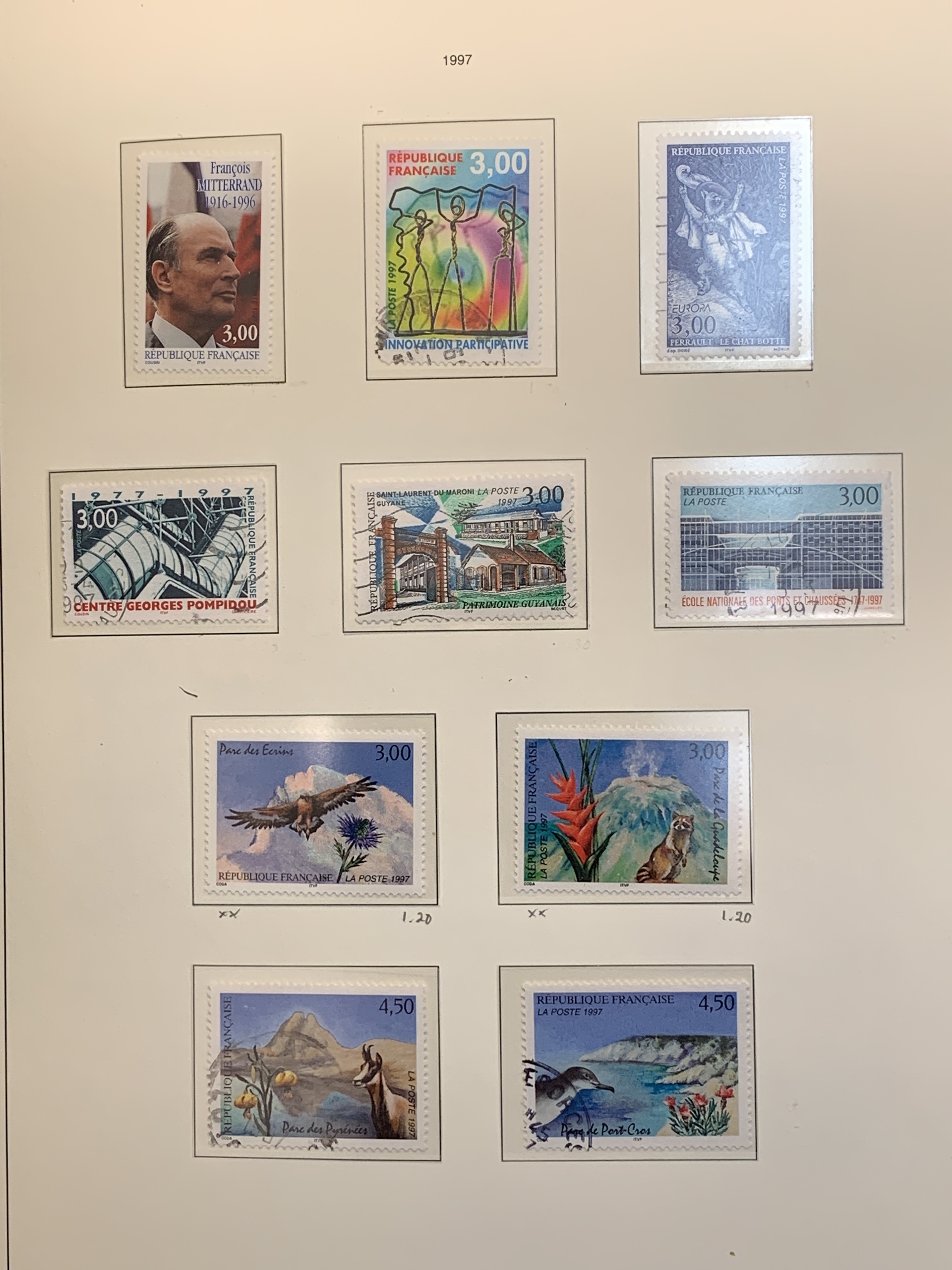 France. Collection ★★/⊙ 1990–1999 in red Leuchtturm album with stamp mounts. Approx. 50% ** and 50% used. Well filled including preobliterés 1989–1998. Please see a selection of scans at www.philea.se. Catalogue value acc. to vendor More than EUR 1000 (Mi 2017)