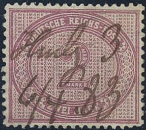 Germany, Reich. Michel 37 or Scott 36 used, 1875 Numeral Type 2 Mk dark red-carmine. Cancelled by pen 6/4 83. EUR 450