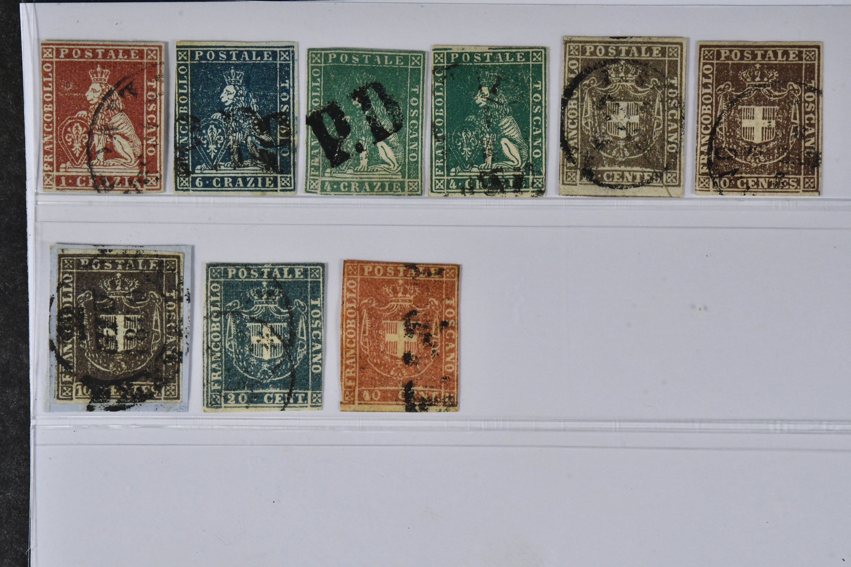 Italy, Tuscany. Used 1851–1860. All different, e.g. Mi 4y, 7y, 13, 14, 19a, 19b, 20a, 21. Mostly good quality. Mi € 825 (9)
