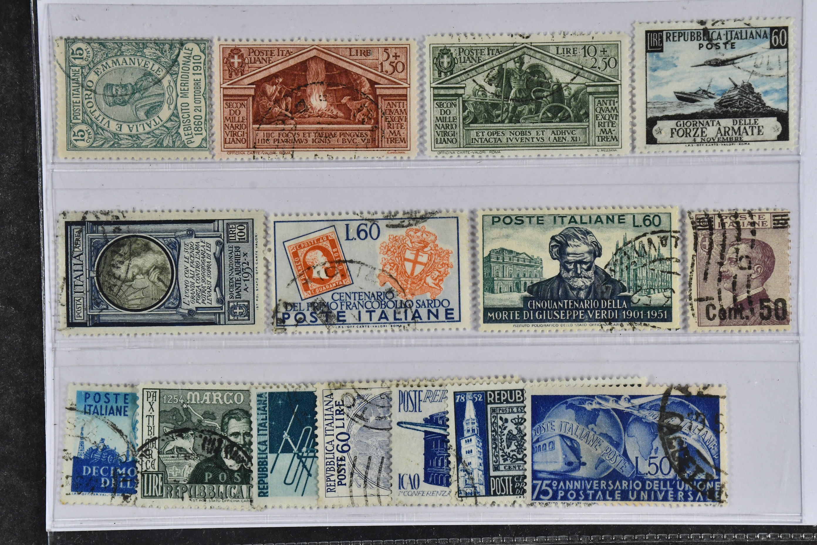 Italy. Used 1910–54. All different, e.g. Mi 98, 352-53, 413, 847, 852. Mostly good quality. Mi € 840 (15)
