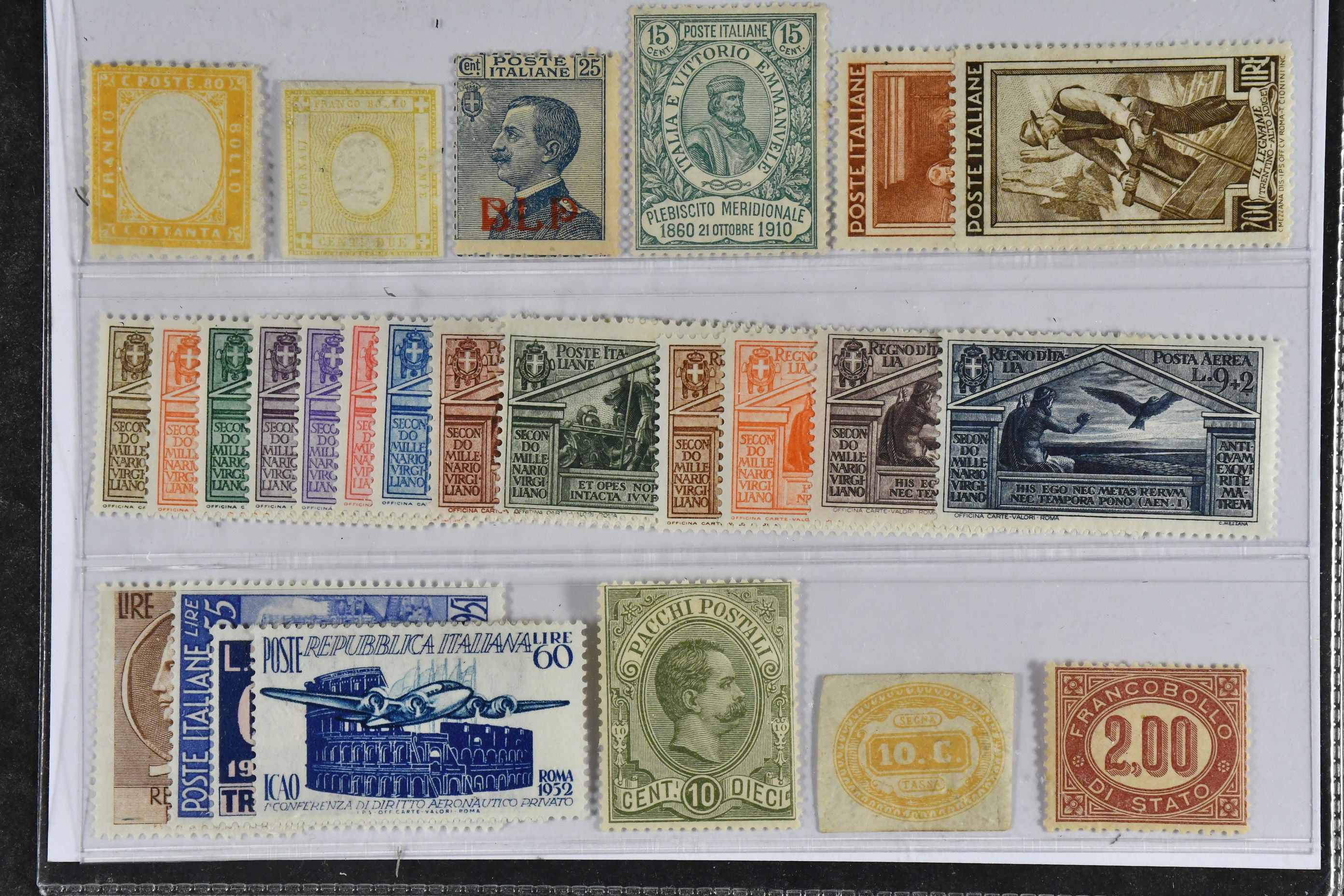 Italy. ★ 1855–1954. All different, e.g. Mi 12-13 (*), B90 I (*), 98, 345-57, 824-25, 920A, parcel 1, postage due 1 (*). Mostly good quality. Mi € 1.029 (26)