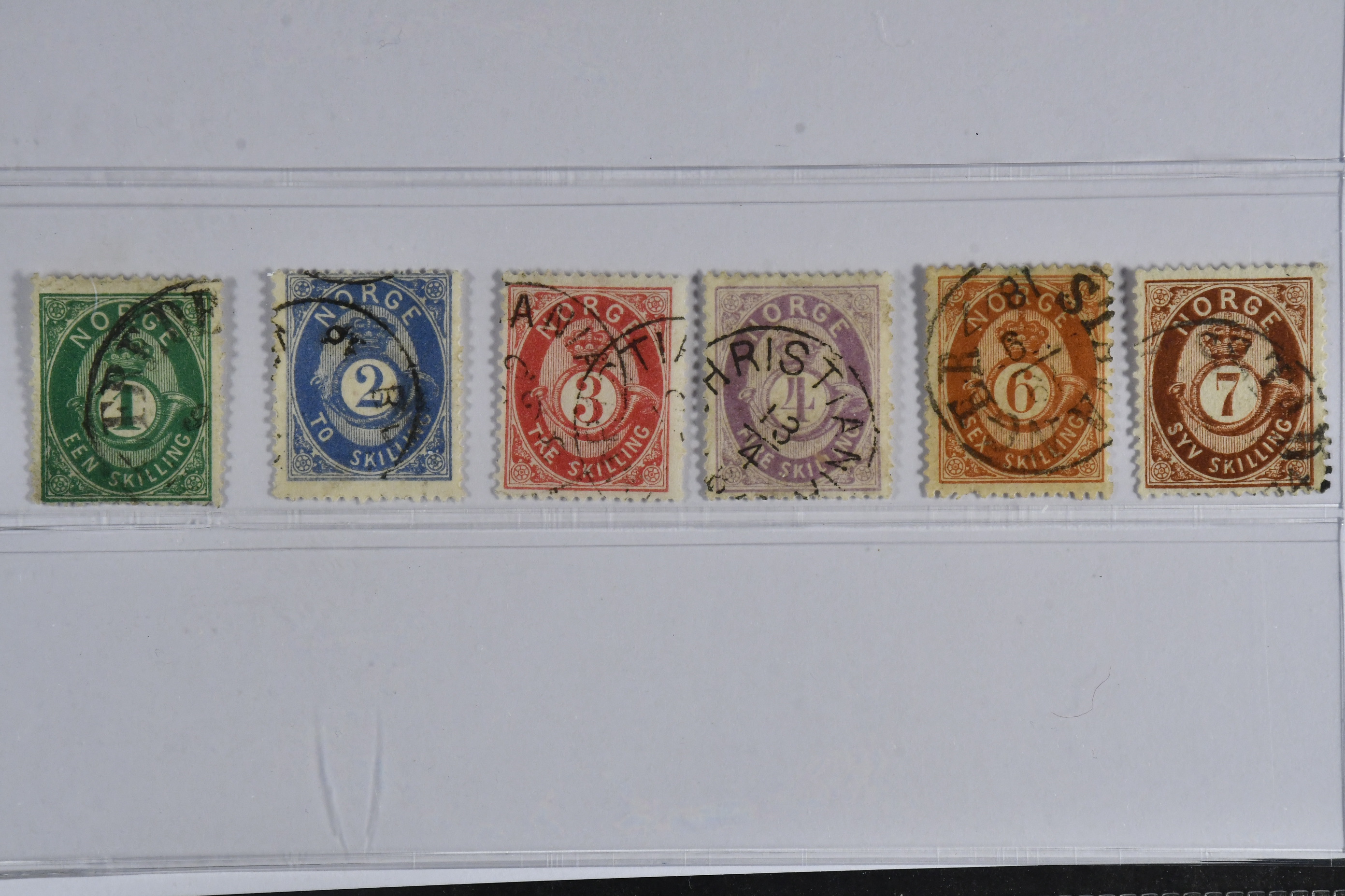 Norway. Facit 16–21 used, 1873 Shaded Posthorn 1–7 skilling SET (6). SEK 2900
