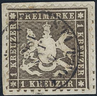 Germany, Württemberg. Michel 21 or Scott 30 used, 1862 Coat-of-arms 1 Kr brown perf 10 (4). On piece, signed Krause. EUR 550