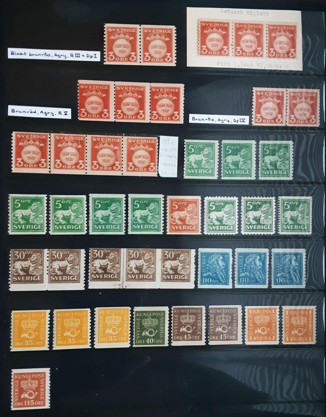 Sweden. Collection ★★/★ COIL STAMPS on visir leave. Incl. a few better, plus varities such as F139 with RII "Higlett", RIII and V, and Dp I and IV, plus 2×148 with plate join signs. Mostly fine quality. Facit 21340 according to vendor (42)