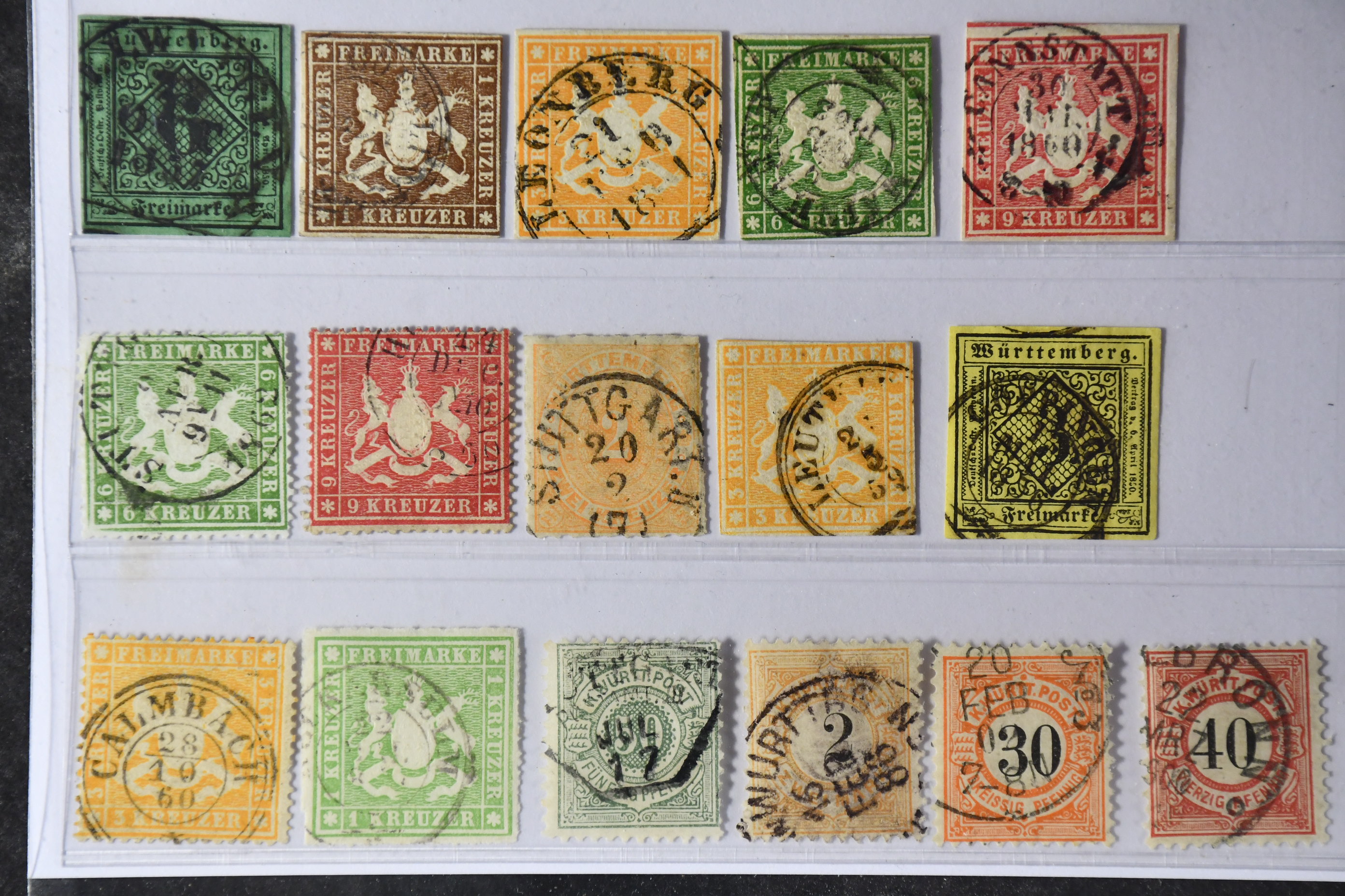Germany, Württemberg. Used 1851–1900. All different, e.g. Mi 3, 11-14, 18x, 19x, 37. Mostly good quality. Mi € 970 (16)