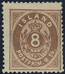 Iceland. Facit 3 ★, 1873 Skilding values 8 sk brown, perf 14 × 13½. Almost off-centered. SEK 2800