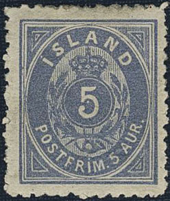Iceland. Facit 23 ★, 1876 Aur values 5 aur blue-grey, rough perf 12¾. A bit uneven perf. SEK 3200