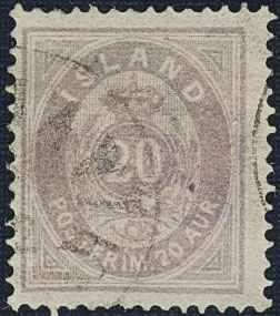 Iceland. Facit 14a used, 1876 Aur values 20 aur pale violet, blurred print perf 14 × 13½. SEK 4400