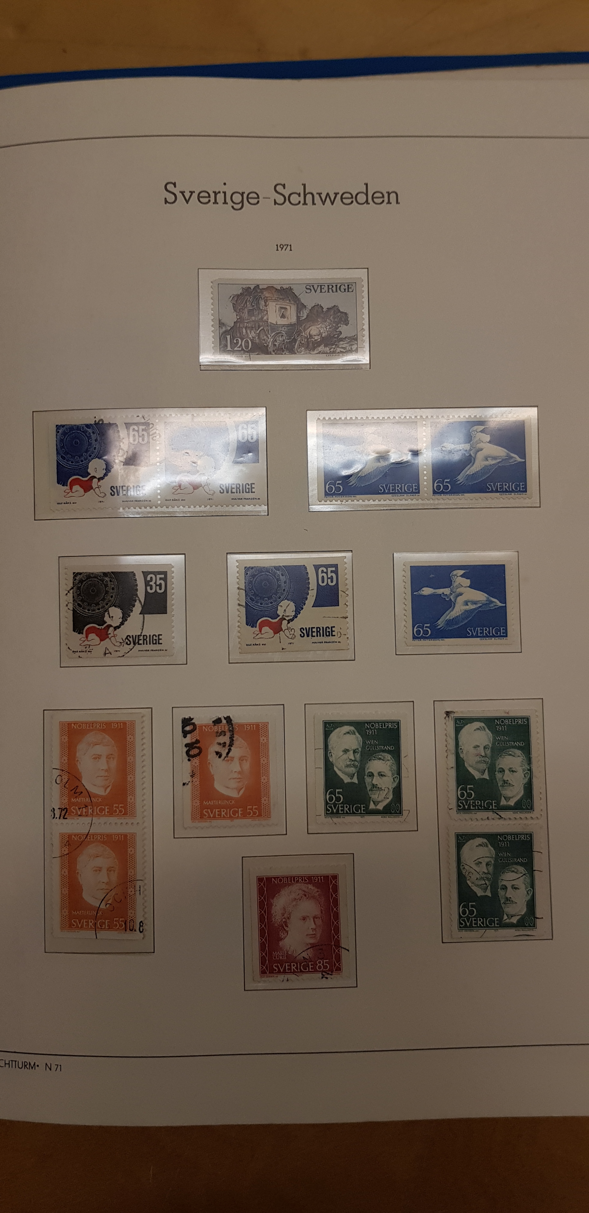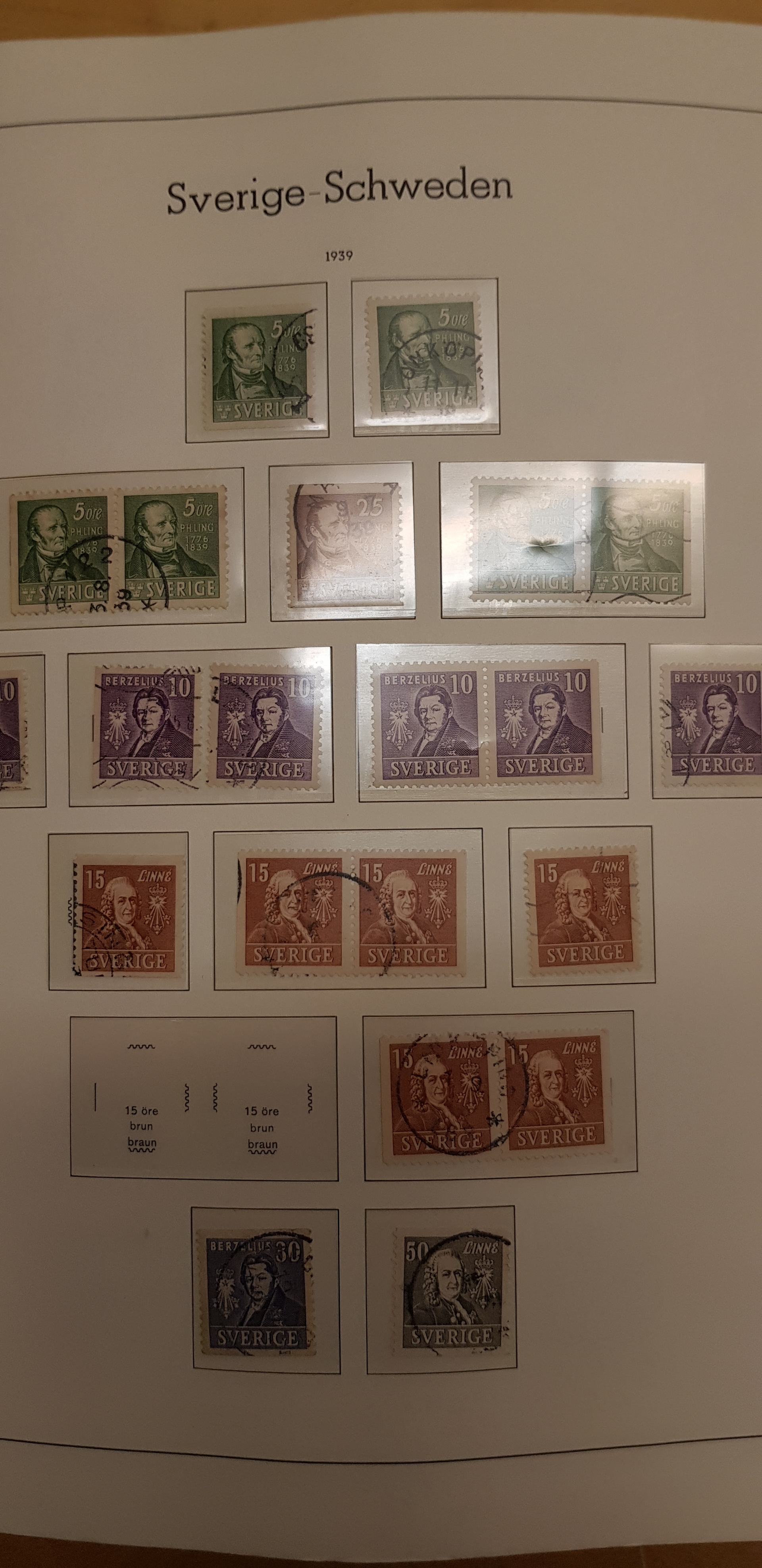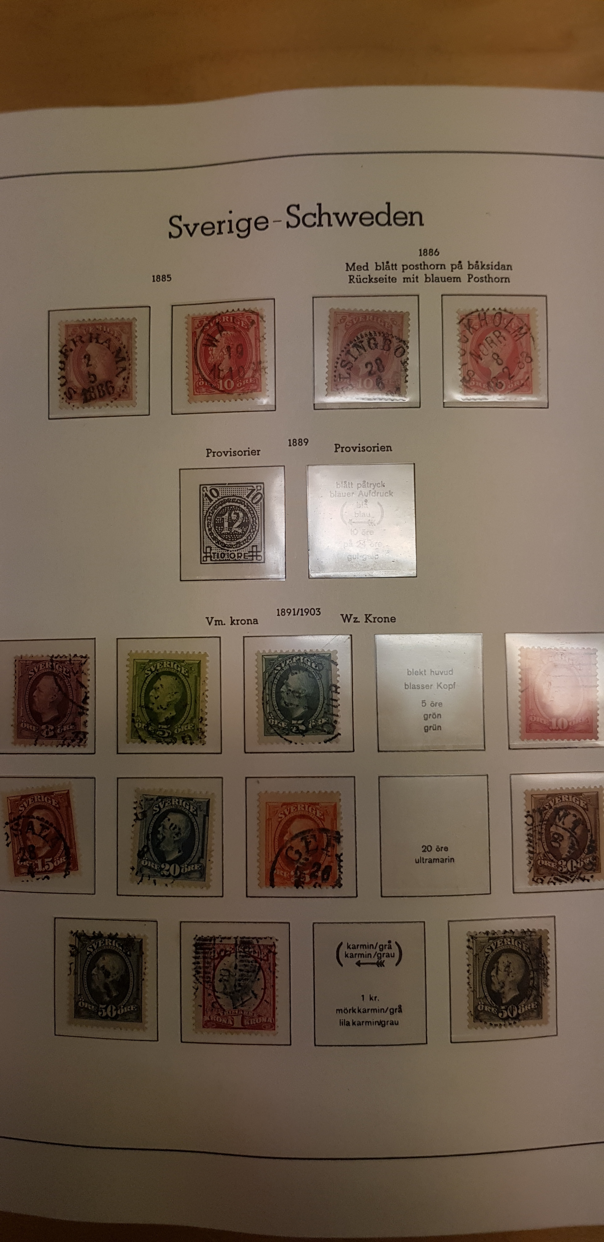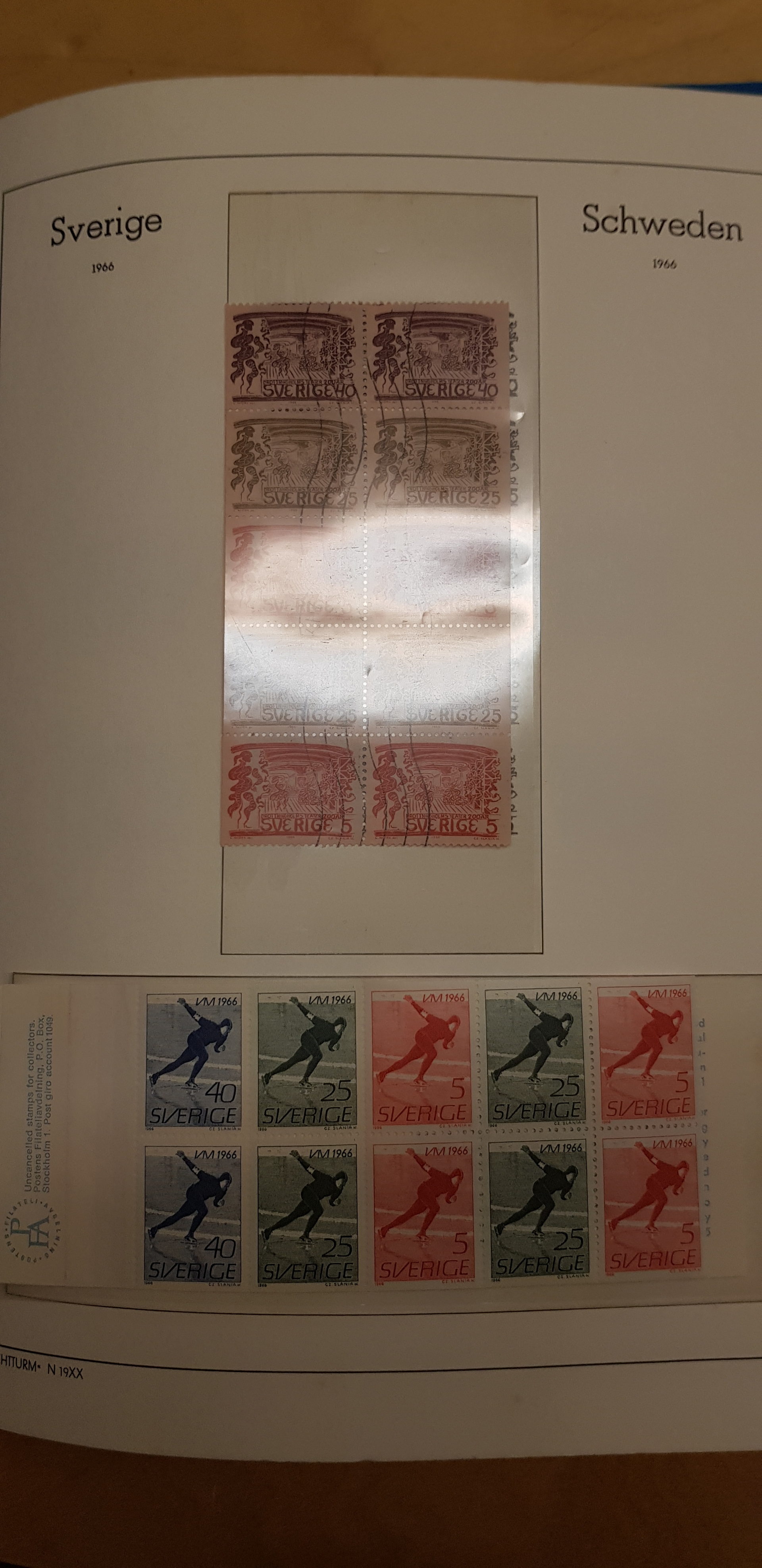Sweden. Collection ★★/★/⊙ 1855–1973 in Leuchtturm album without stamp mounts. According to the owner the value of this assembly is 19000 SEK. The 4-shilling banco is good, there are also some 3+4 and 4+3 combinations. Please see a selection of scans at www.philea.se. Mostly fine quality. (>1000)