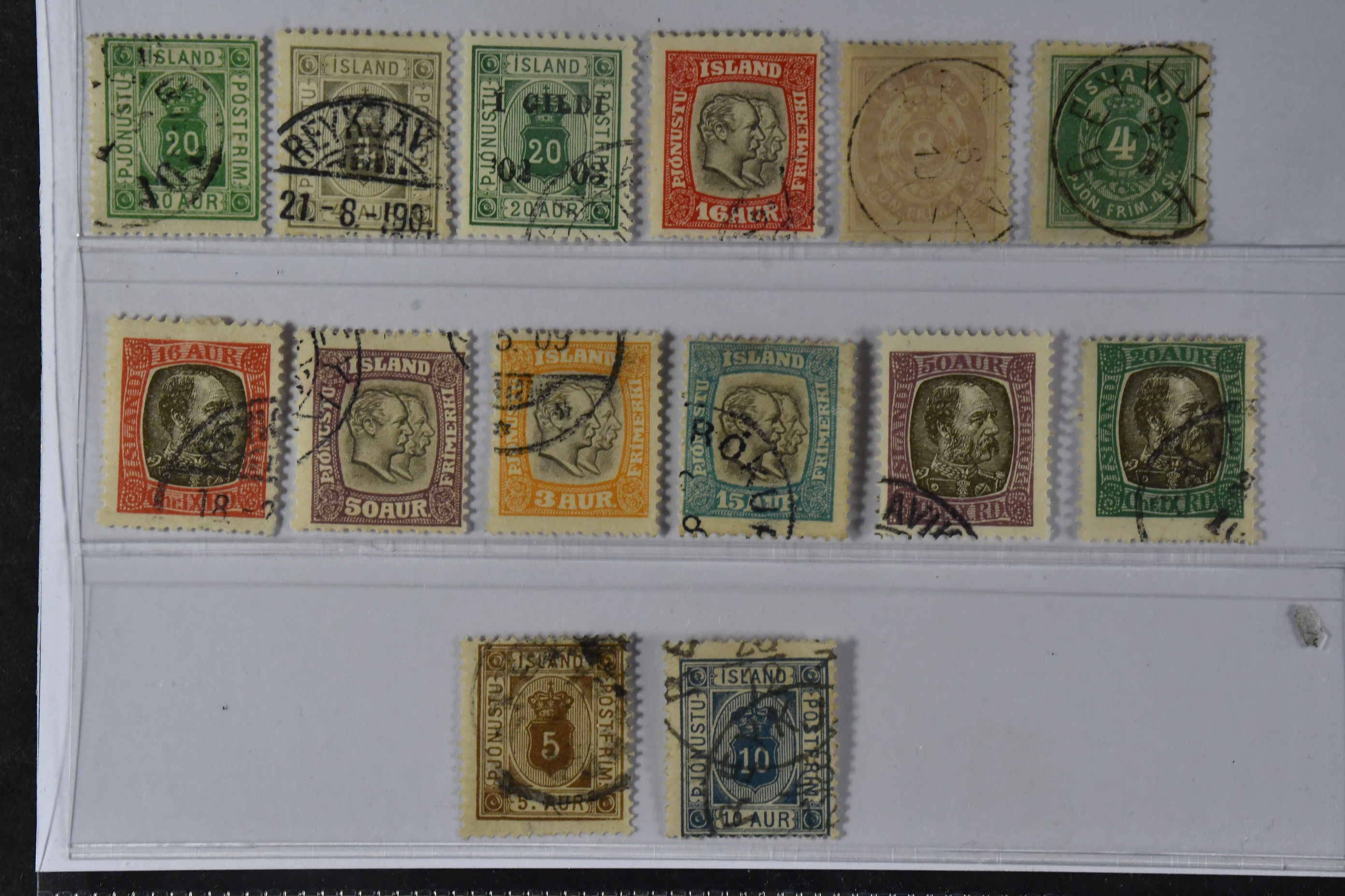 Iceland. Used 1873–1918. Officials. All different, e.g. Tj 2, 3 (thin), 8, 11, 25, 28. Mostly good quality. F SEK 11690 (14)