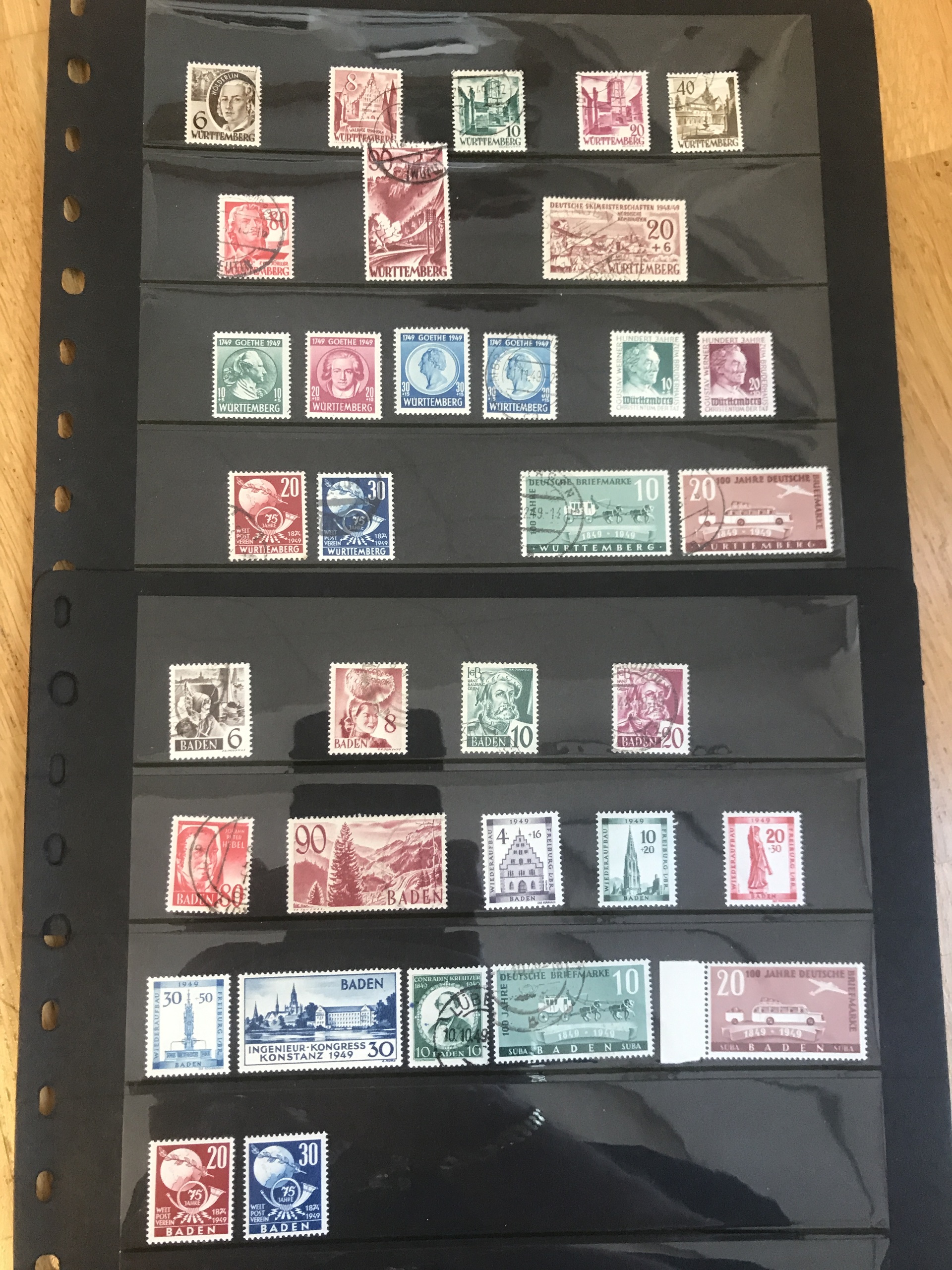 Germany, French zone. Mostly used. Collection 1945–49 on leaves incl. e.g. General issues Mi1–13 used, Württemberg Mi35–37 used, some better Baden, etc. (>150)