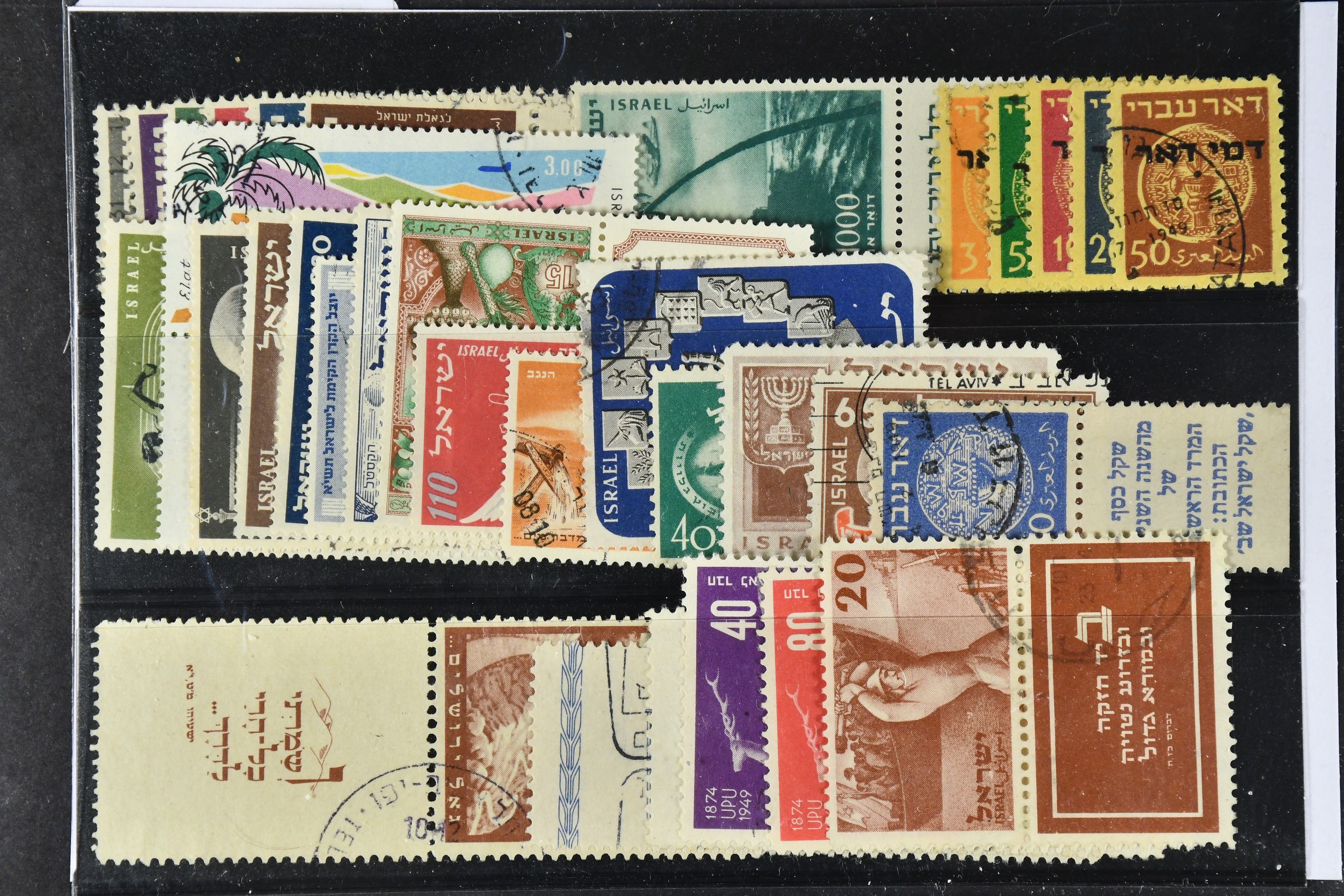 Israel. Used 1948–60. All different, e.g. Mi 15-16, 18 half tabs, 22-27 all tabs, 30, 41, 58, 61, 86 tab, postage due 1-5. souv. sheet 1. Mostly good quality. Mi € 657 (40)