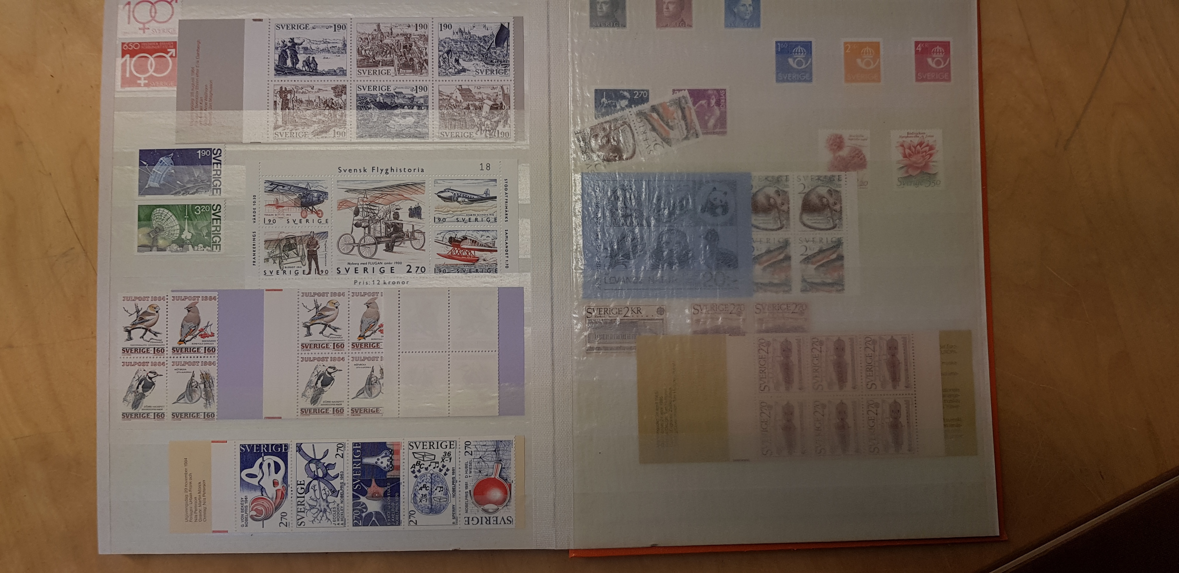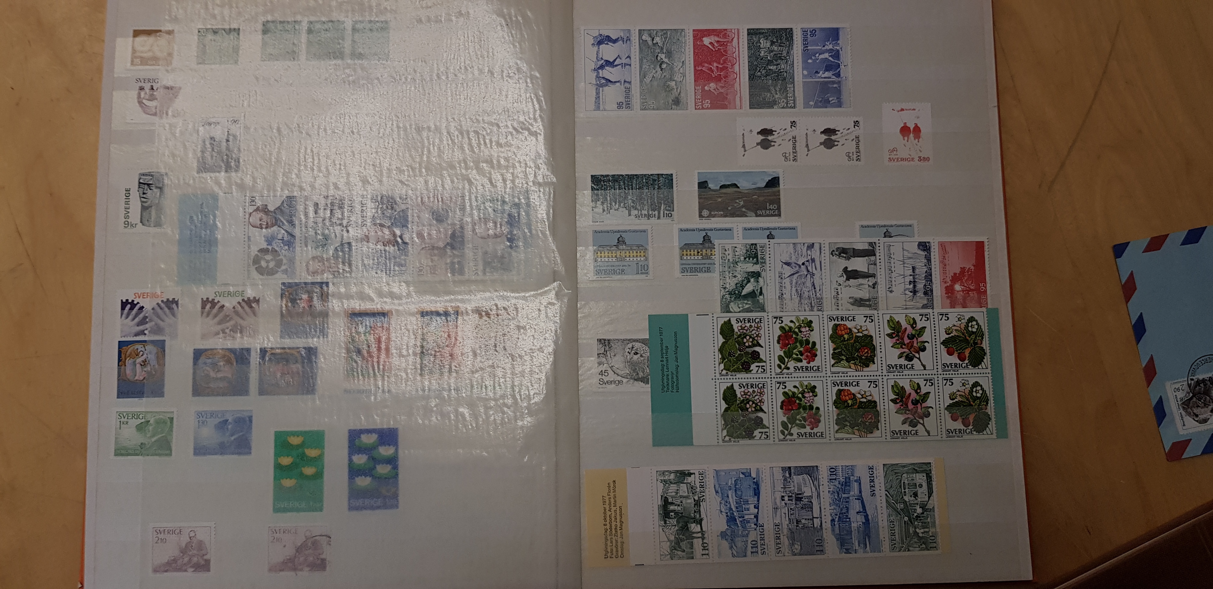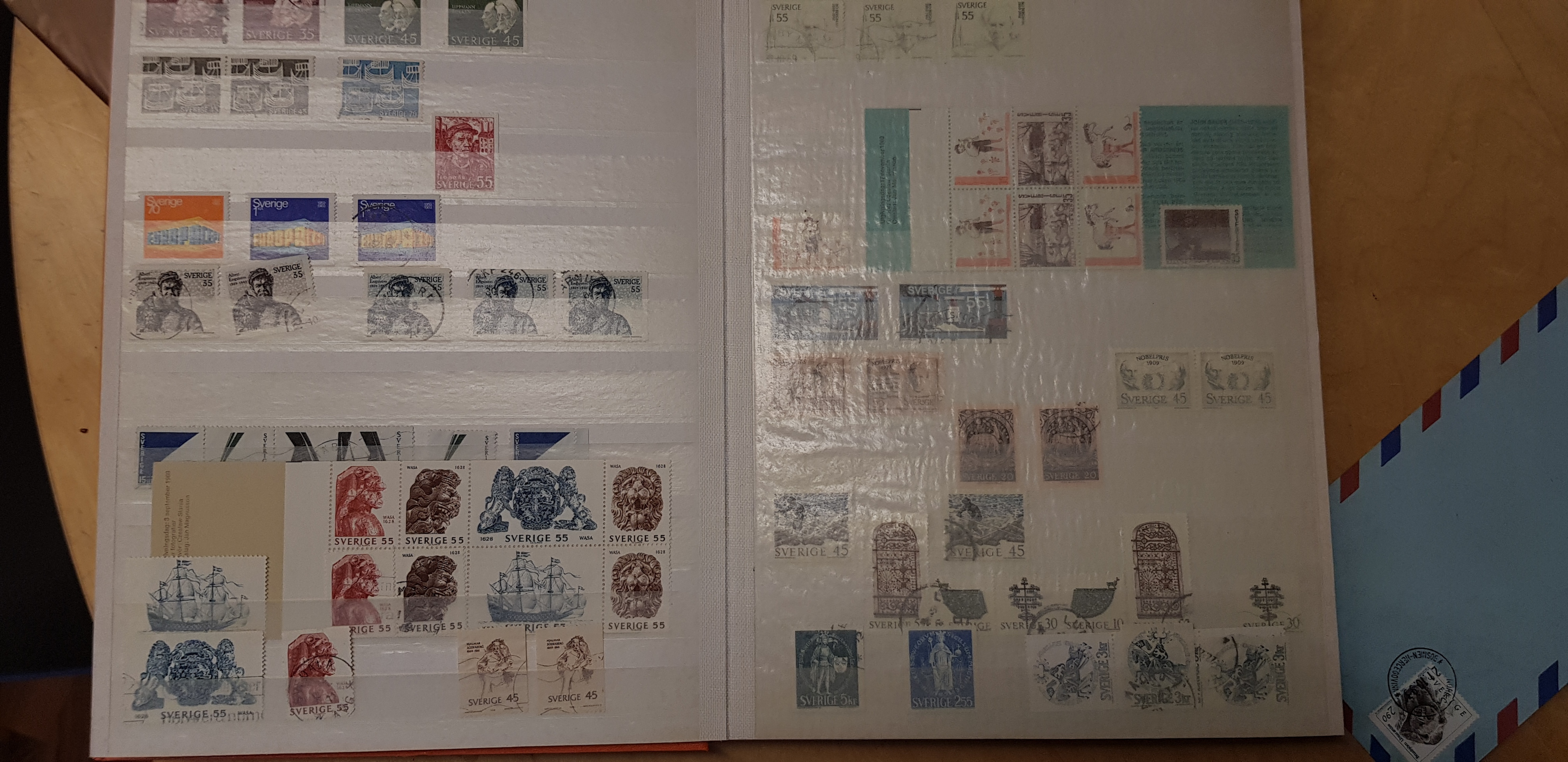 Sweden. Collection/accumulation mostly used 1900s in box. Three albums with Swedish stamps used and unused, FDCs and envelopes. Also plastic envelopes with stamps. Please see a selection of scans at www.philea.se. Mostly fine quality. (>500)