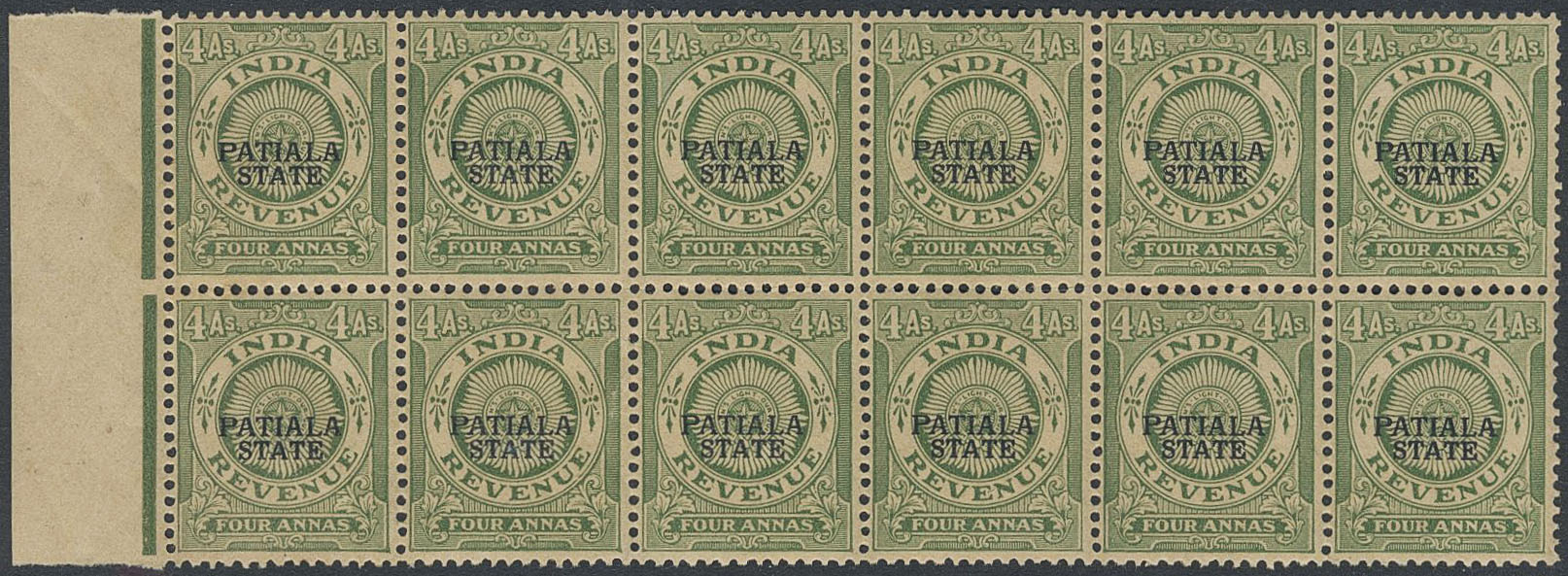 India, Patiala. Michel K&M175 ★★, 1934 Revenue stamp 4 a green in block of 12. EUR 400