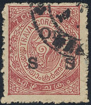 India, Travancore. SG O26d used, 1911 7 ch carmine. Not priced in SG.