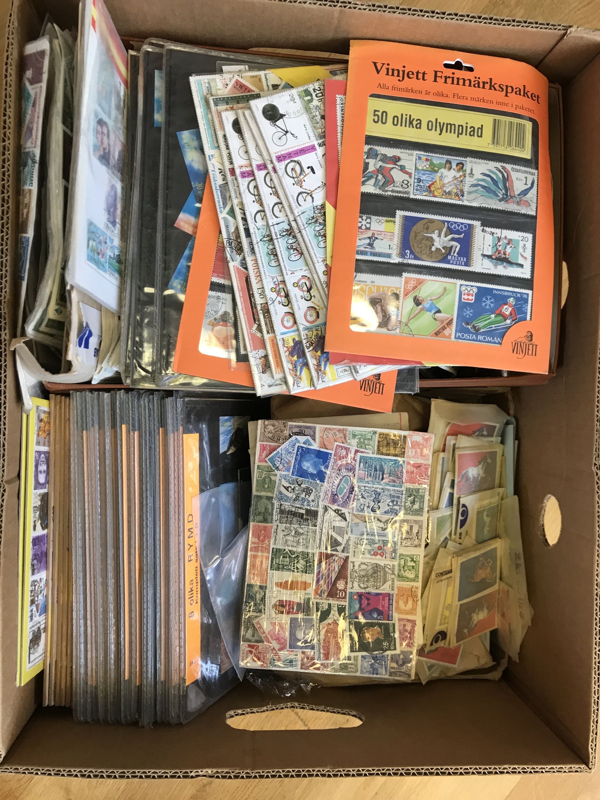ALL WORLD. Mostly used. Banana box with 1000s of stamps incl. e.g. several made-up packets, thematics, stamps in envelopes, etc. Approx. 11 kg.