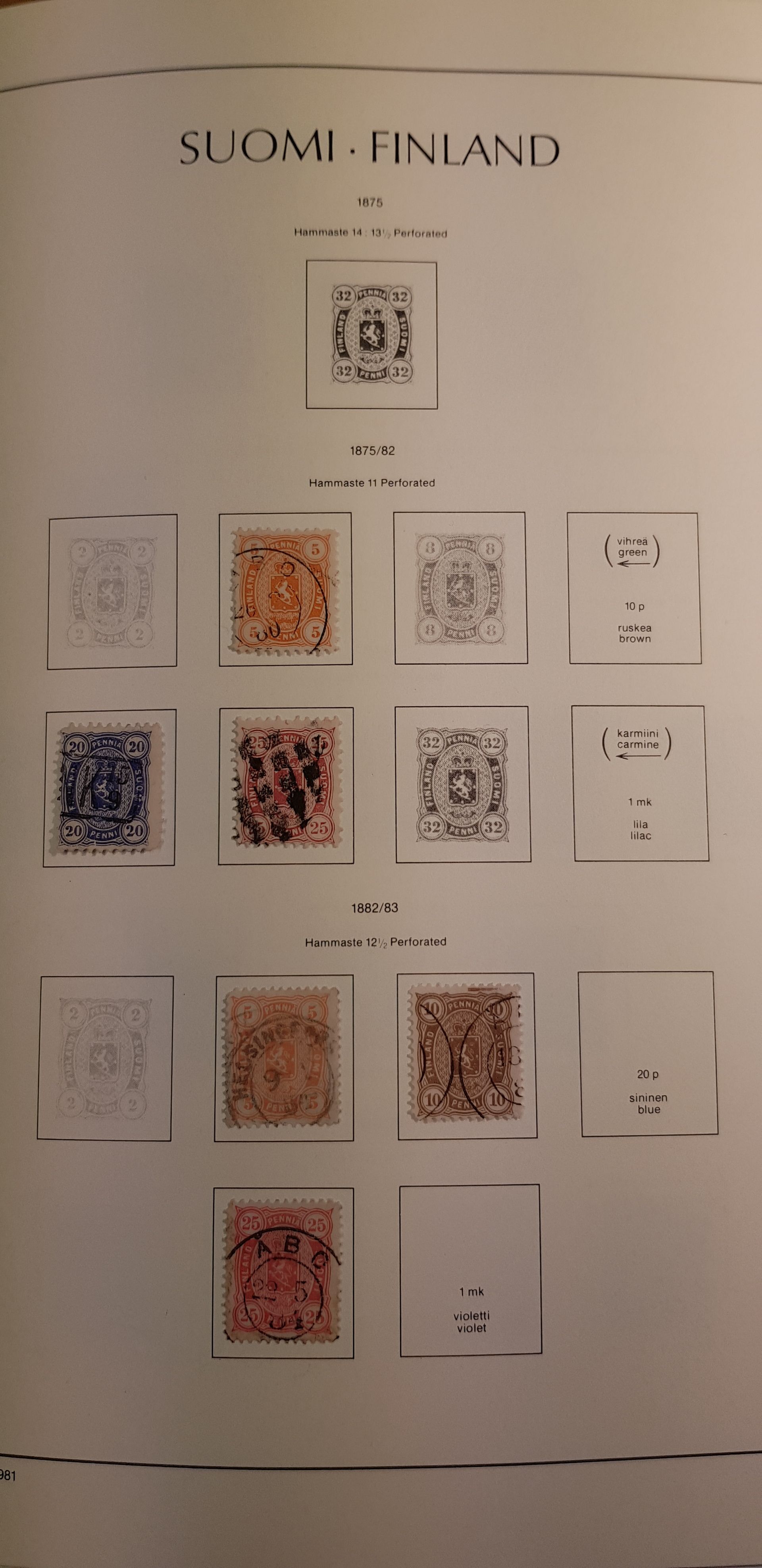Finland. Collection mostly used 1866–1989 in Leuchtturm album with stamp mounts. A very nice assembley of Finland. Also one album with duplicates. Please see a selection of scans at www.philea.se. Fine quality.