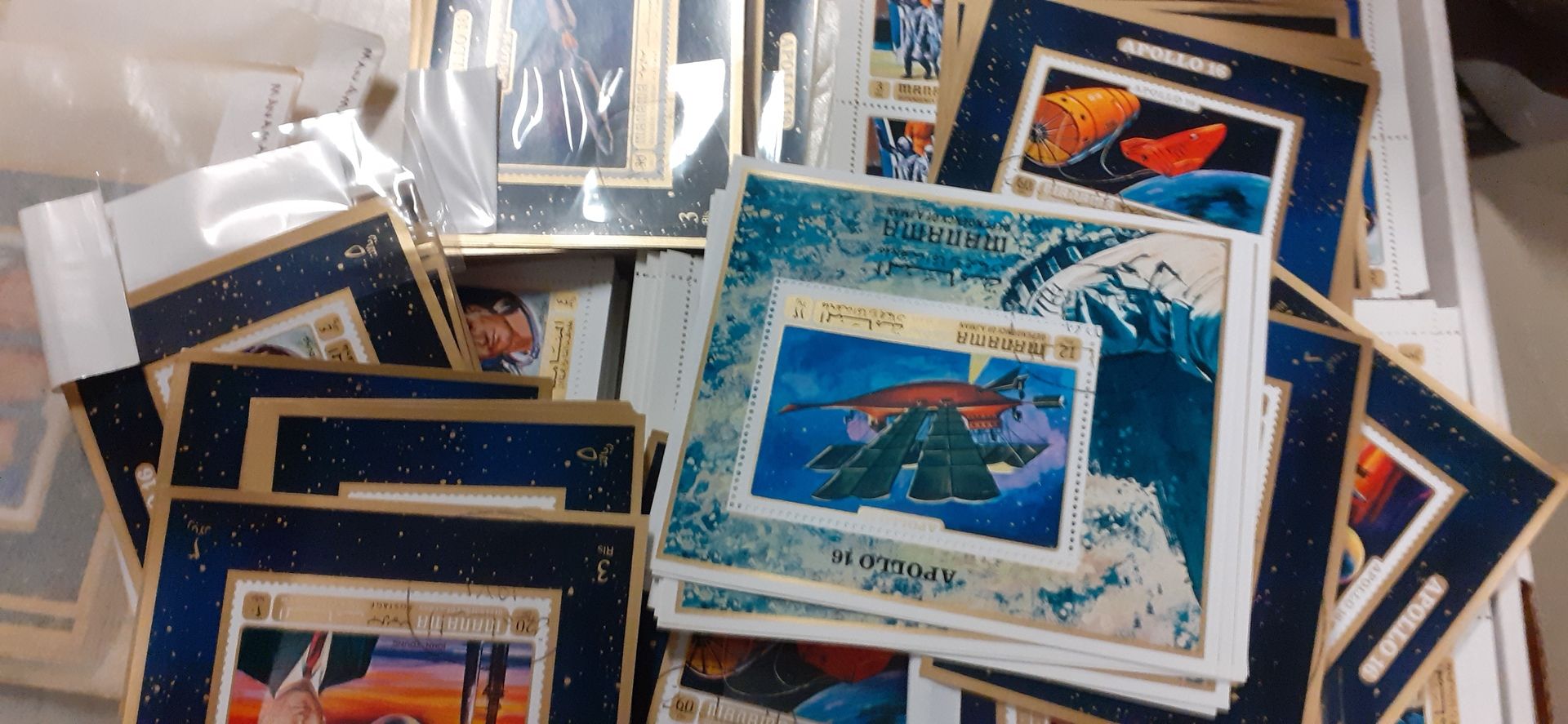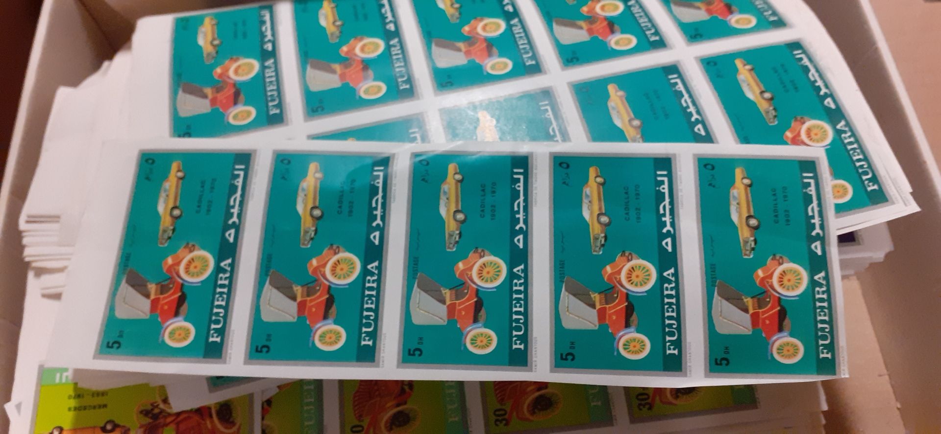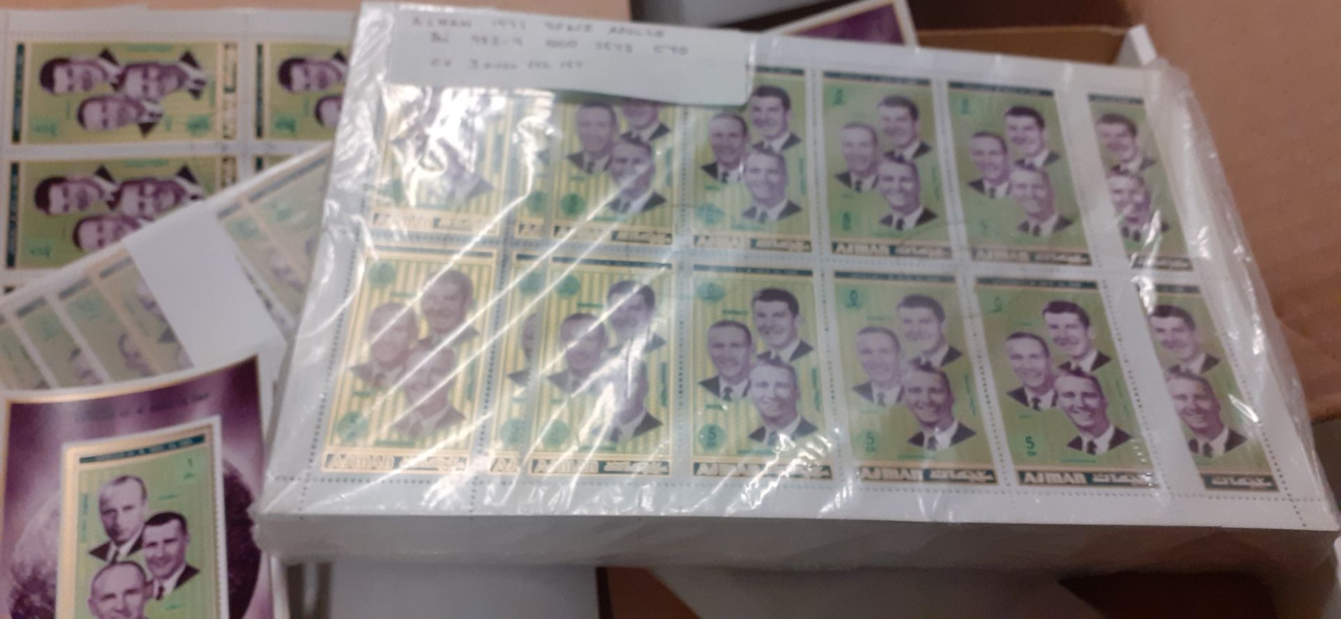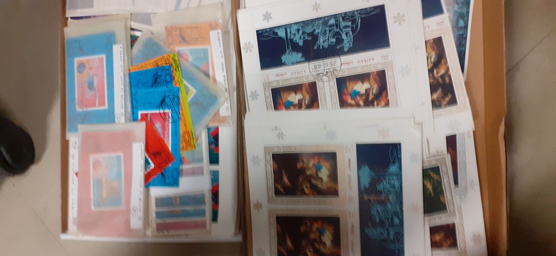 United Arab Emirates, Trucial states. Mostly used. More than 13 kgs of sets (some incomplete but also complete) and souvenir sheets, apparently all listed in Michel, of various thematic sets from e.g. Manama and Fujeira. Enourmous catalogue value. Some ** are also included. Approx. 15 kg.