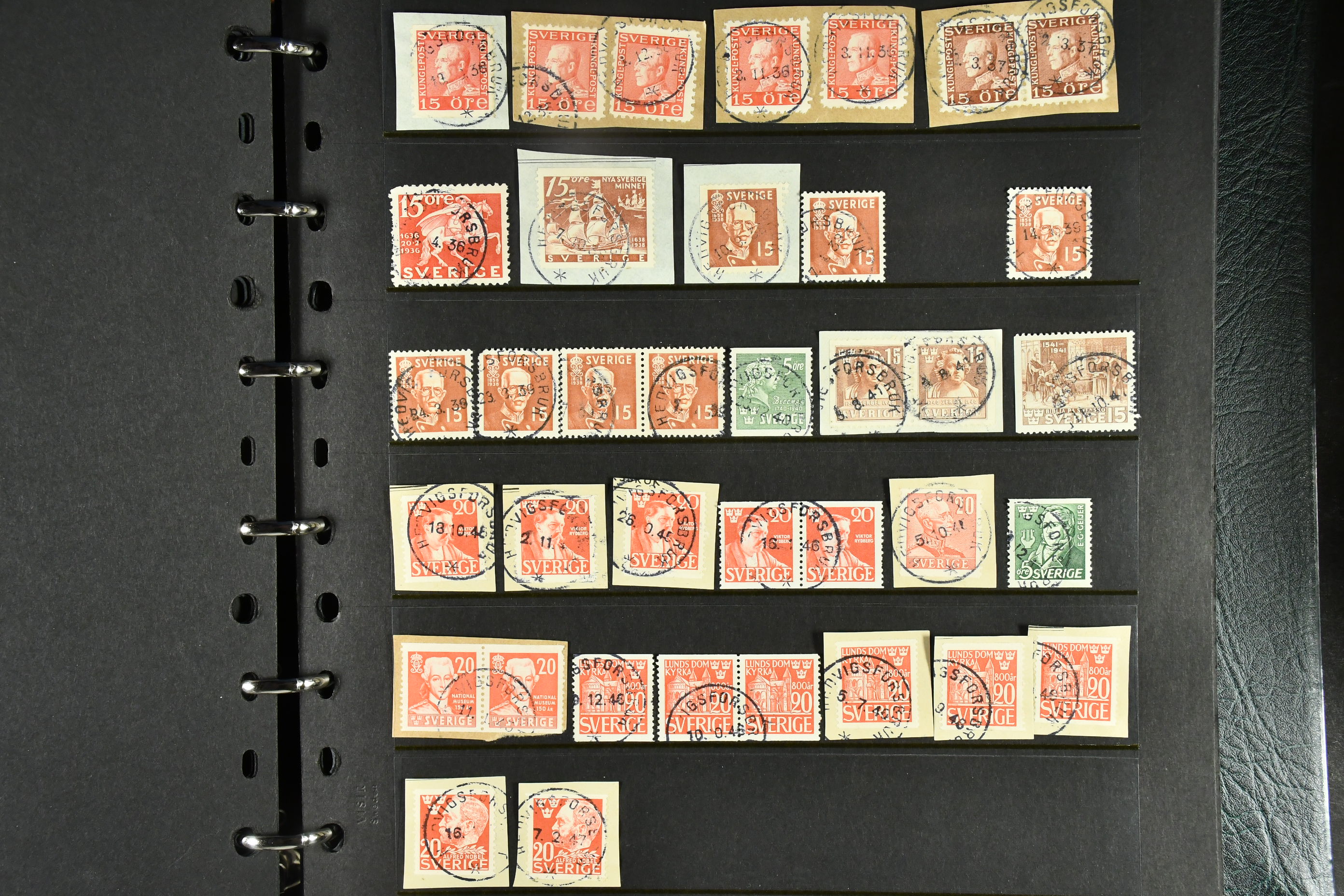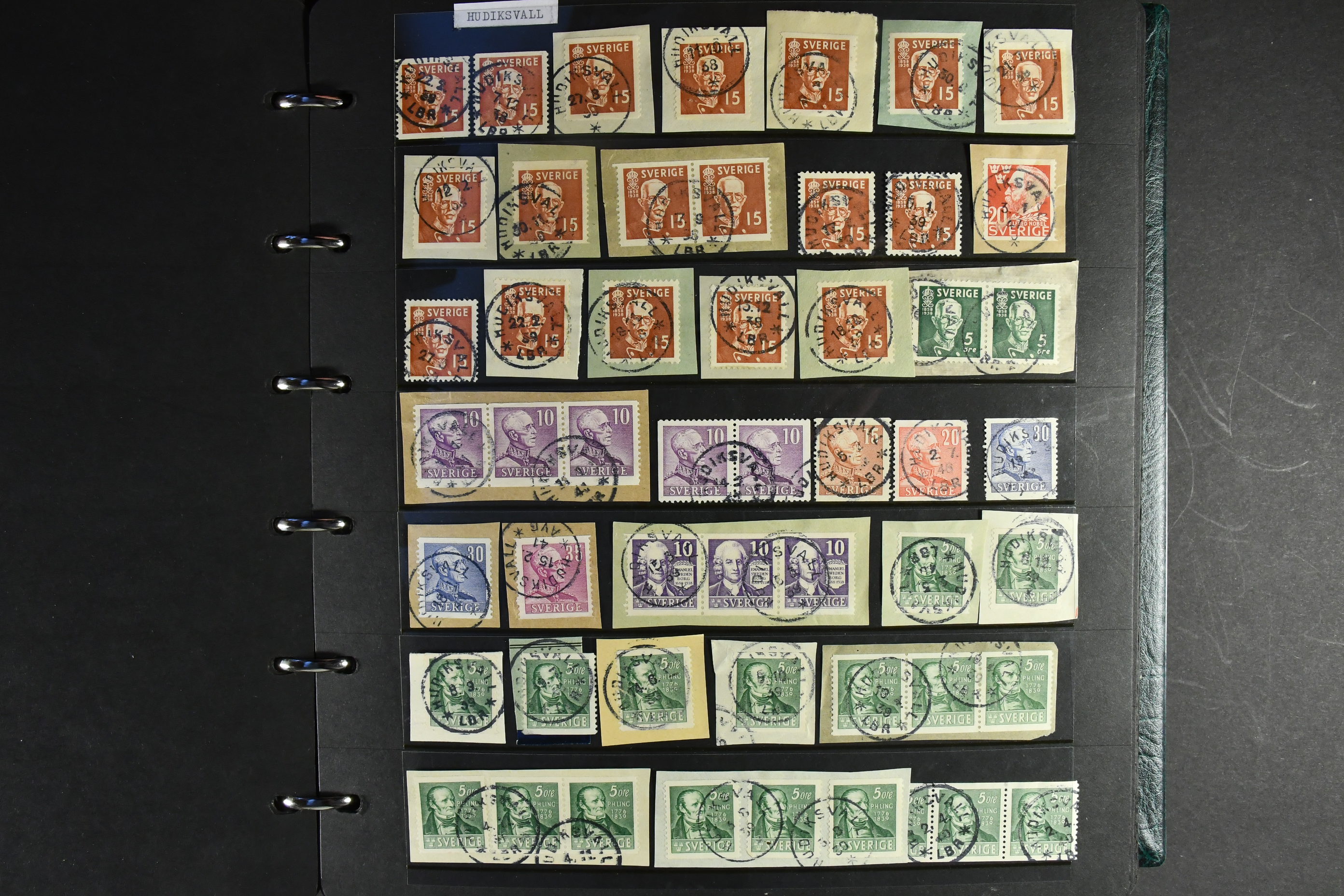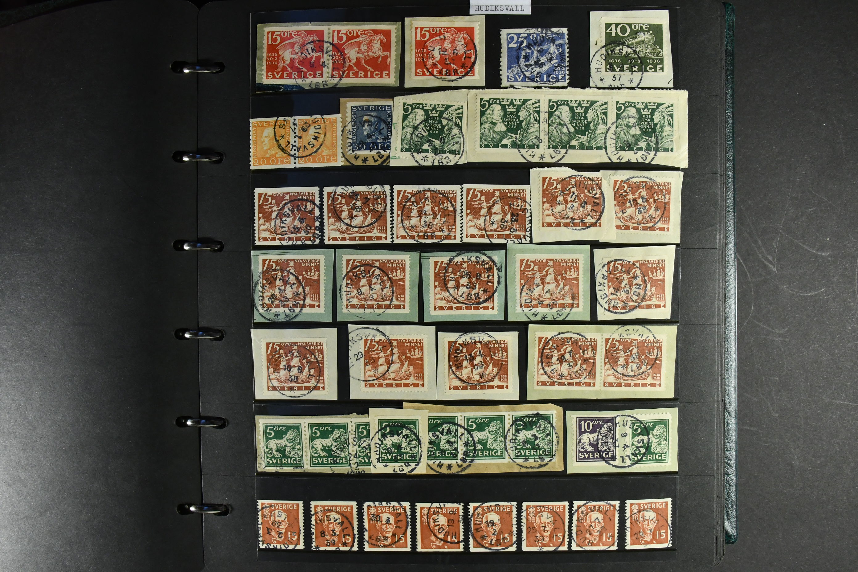 Sweden. Cancellations, collection/accumulation 1930–1950 in visir album. City/village cancellations from the county of Hälsingland and, additionally, city/village cancellations from the whole country organized according to the first letter in the name. Please see a selection of scans at www.philea.se. Fine quality. (>1000)