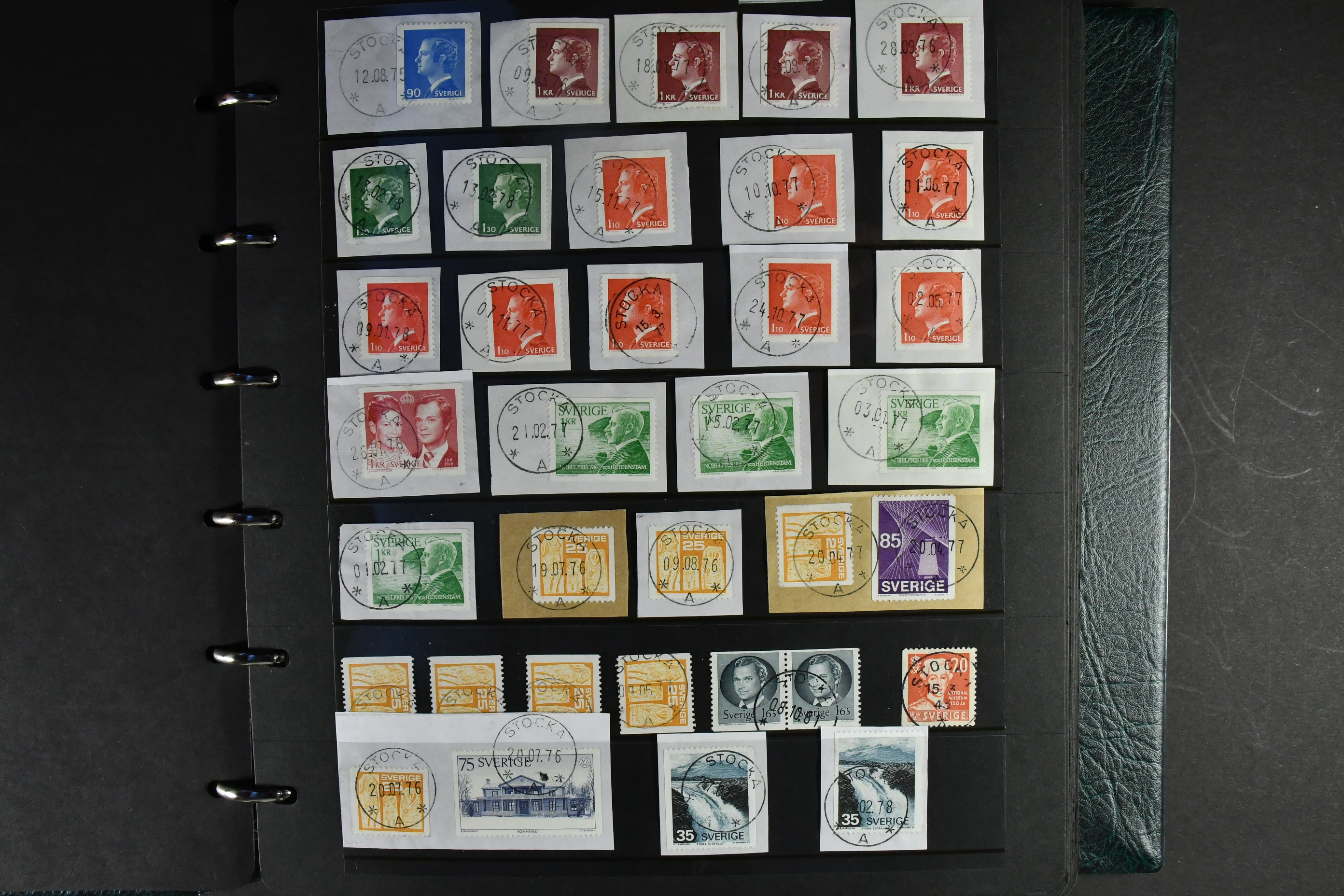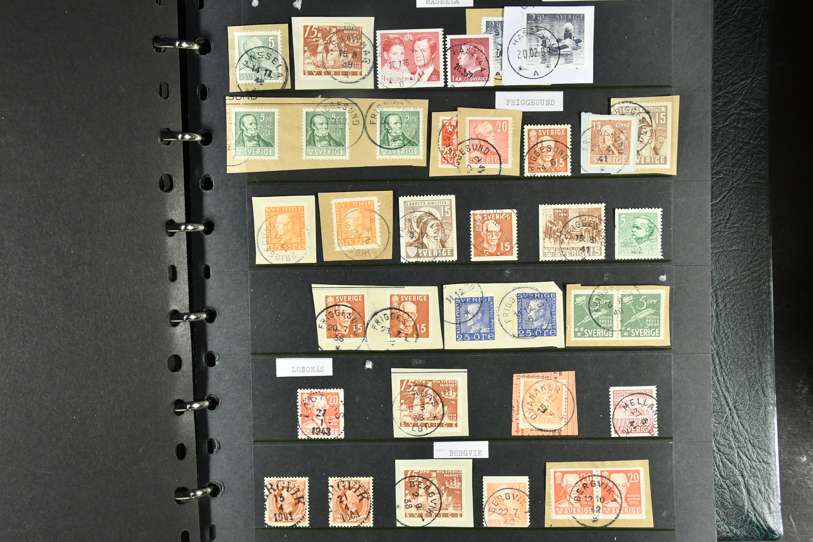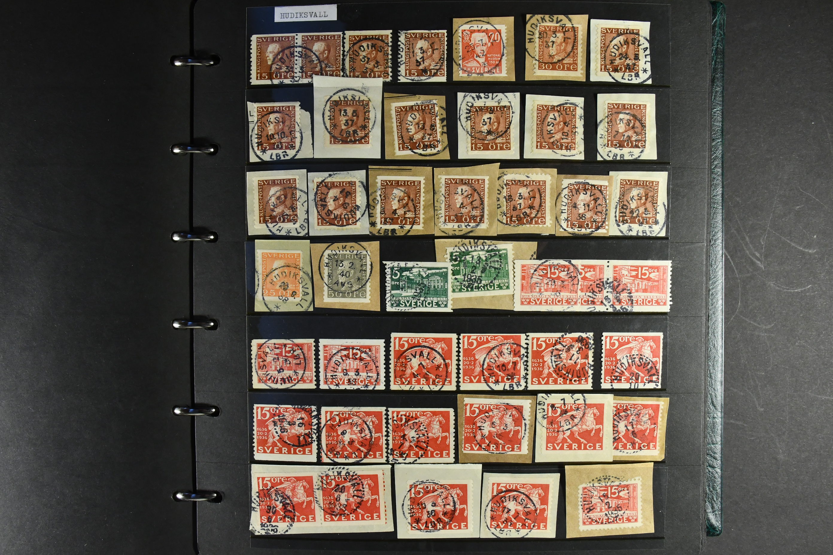 Sweden. Cancellations, collection/accumulation 1930–1950 in visir album. City/village cancellations from the county of Hälsingland and, additionally, city/village cancellations from the whole country organized according to the first letter in the name. Please see a selection of scans at www.philea.se. Fine quality. (>1000)