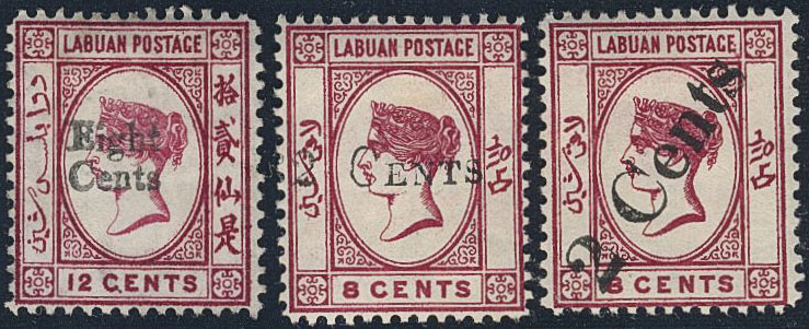 Malayan states, Labuan. Michel 14, 21, 22 ★, 1881–85 8 and 2 c overprint (3). Very fine. SG 15, 23, 26. EUR 390