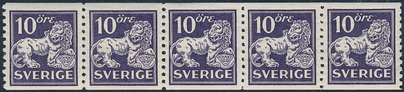 Sweden. Facit 146Ac ★★, 10 öre dark ultramarinish violet type II vertical perf 9¾ on white paper (A3). Superb strip of five. SEK 3750++