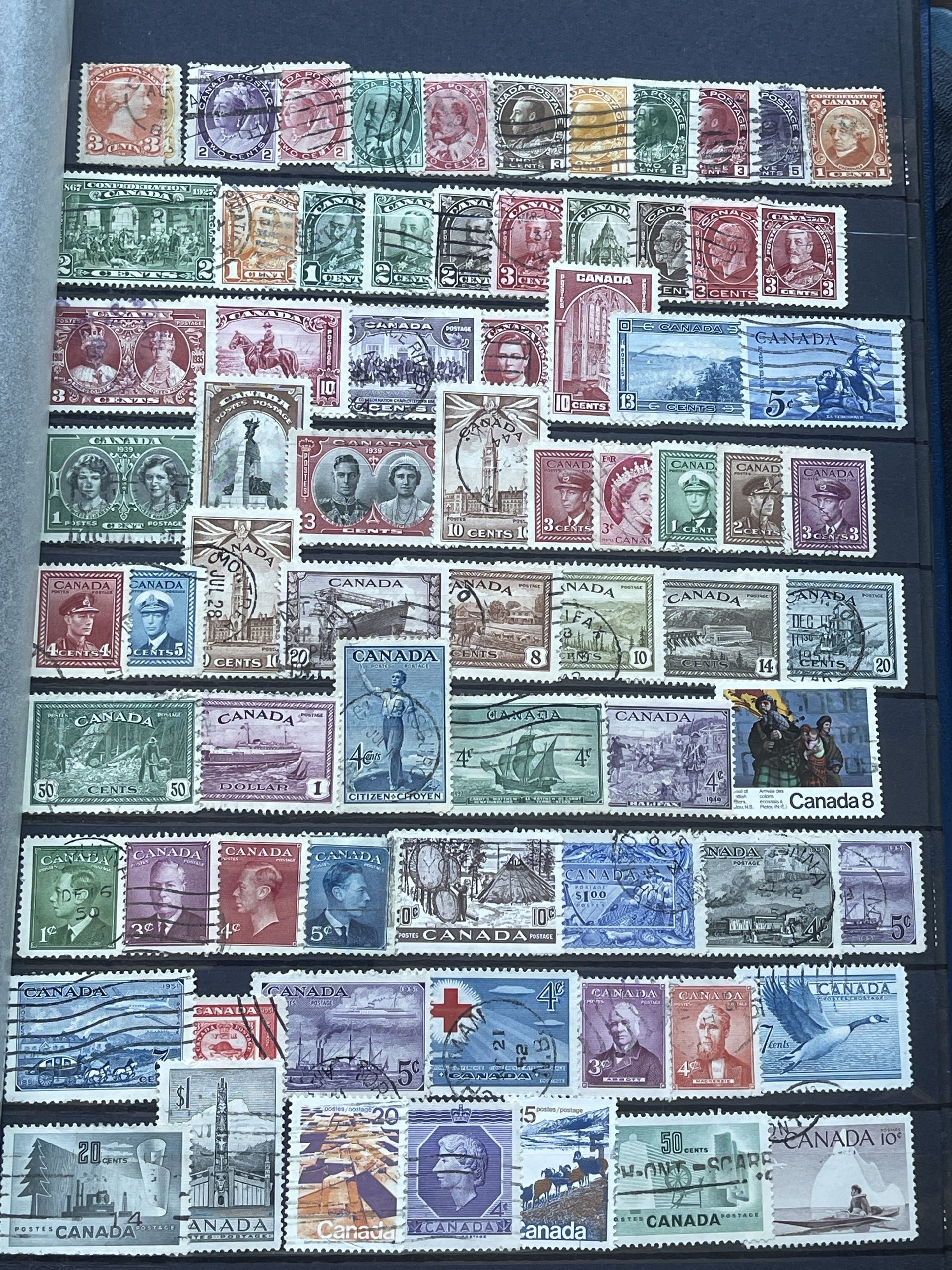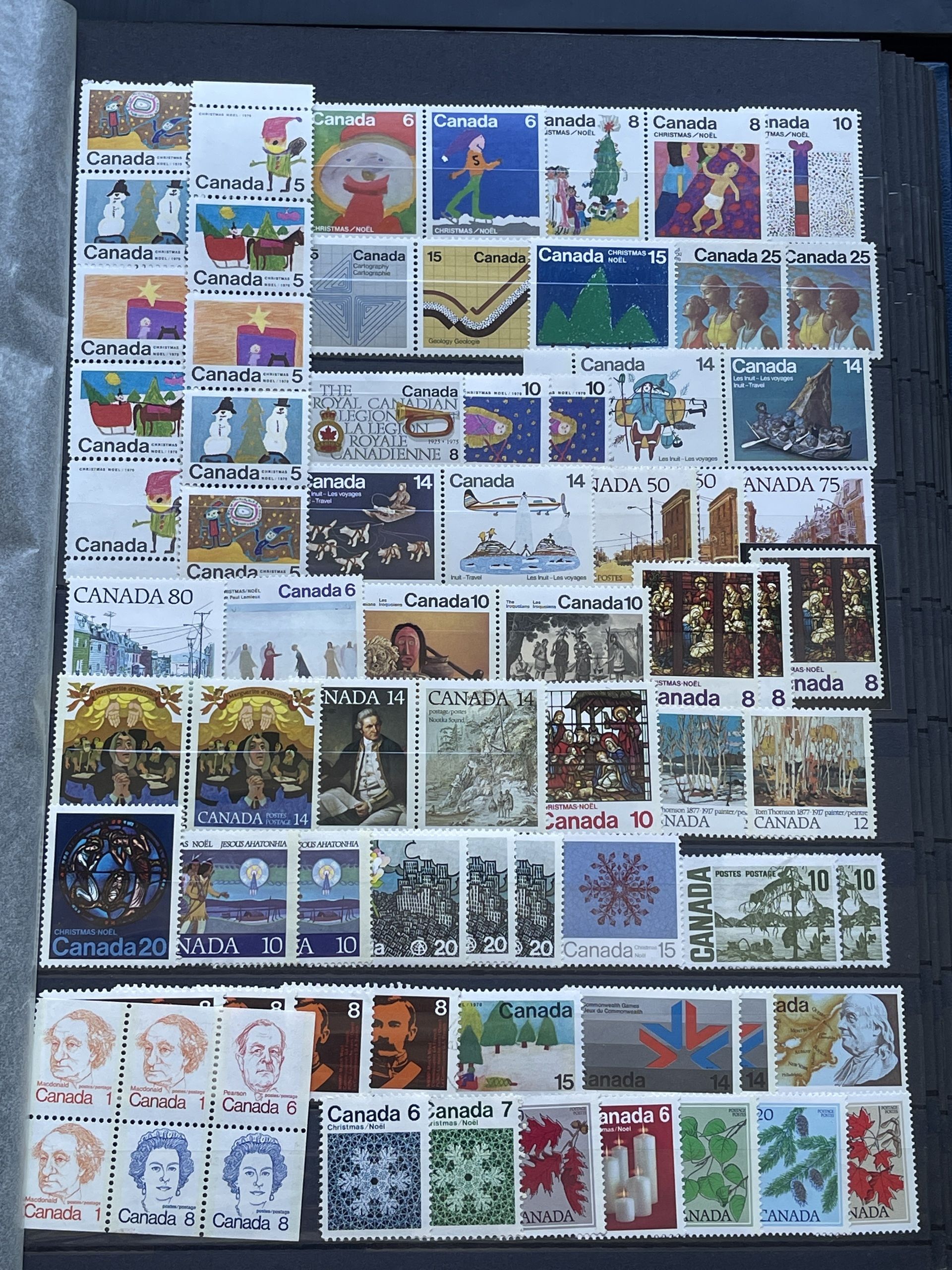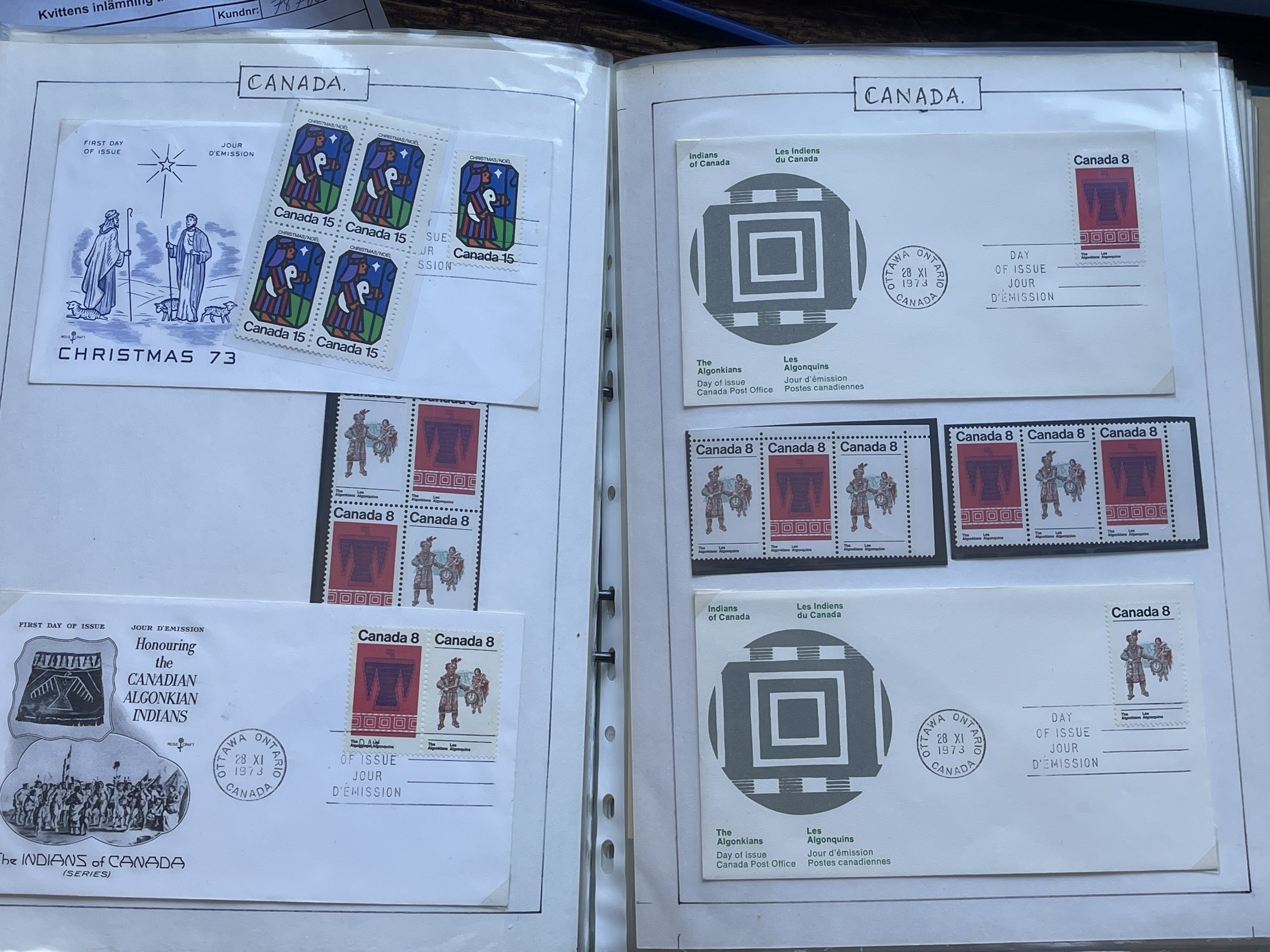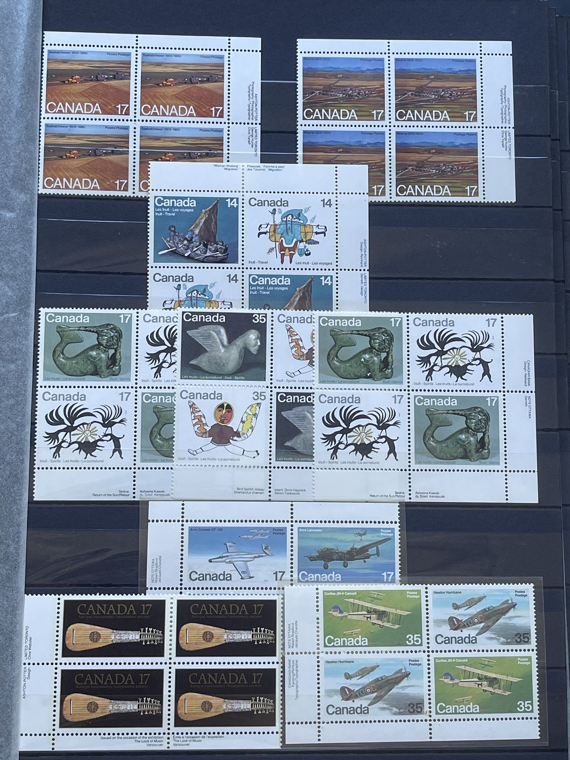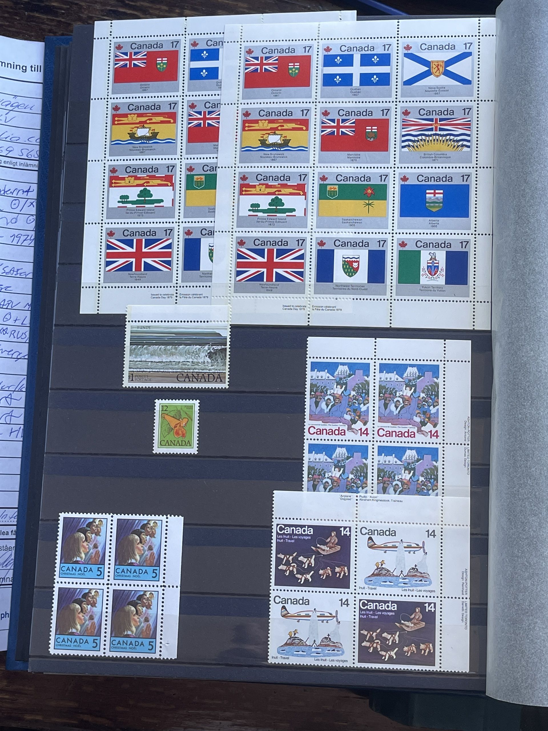 Canada. ★★/⊙ 1800s–modern in stockbook. Collection in one stockbook and one binder with a lot of modern blocks of four ** often combined with FDC. (1000+)