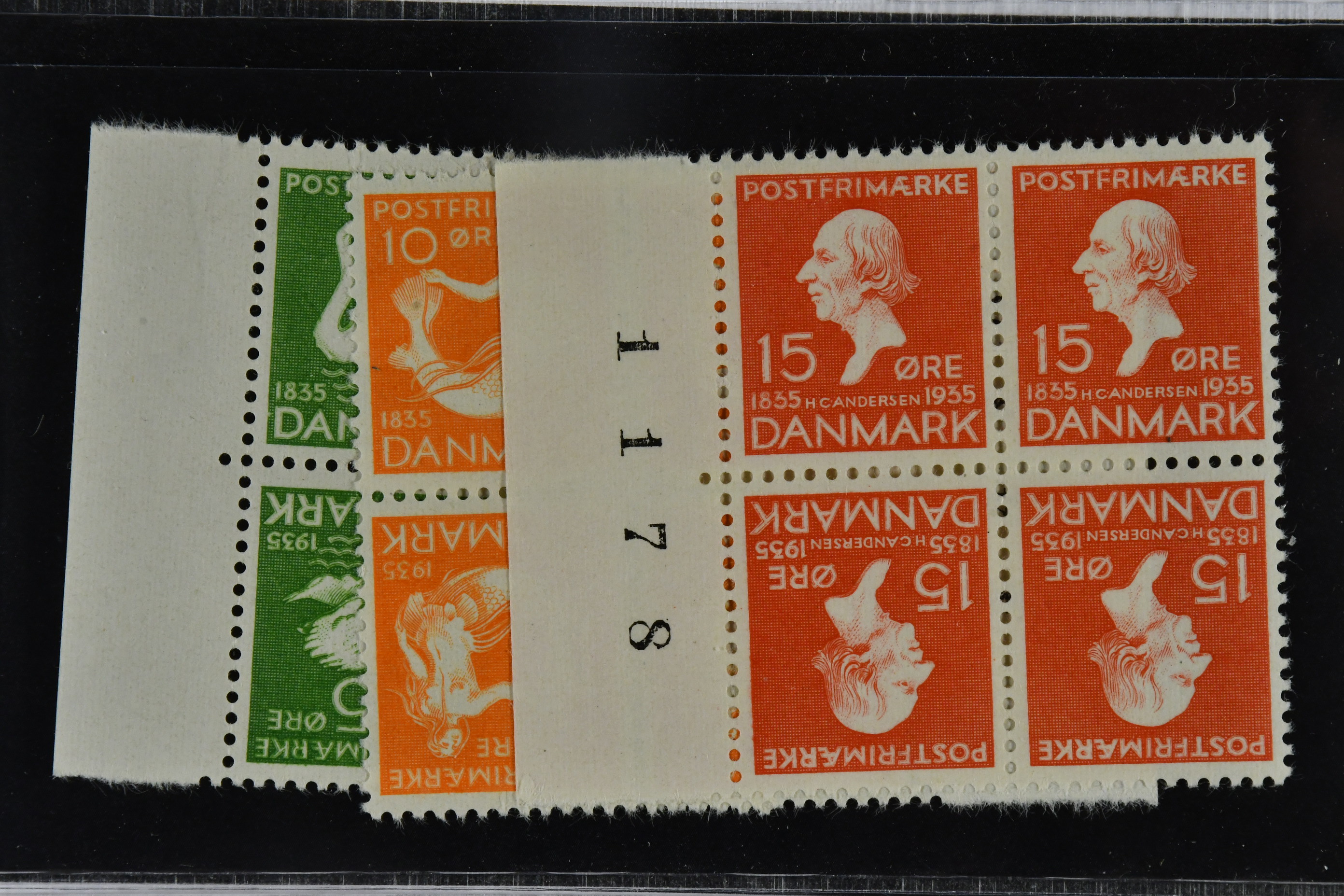 Denmark. Facit 269–71 ★★, 1935 H C Andersen 5, 10 and 15 øre, all in blocks of 4 with tête-bêche. SEK 4300