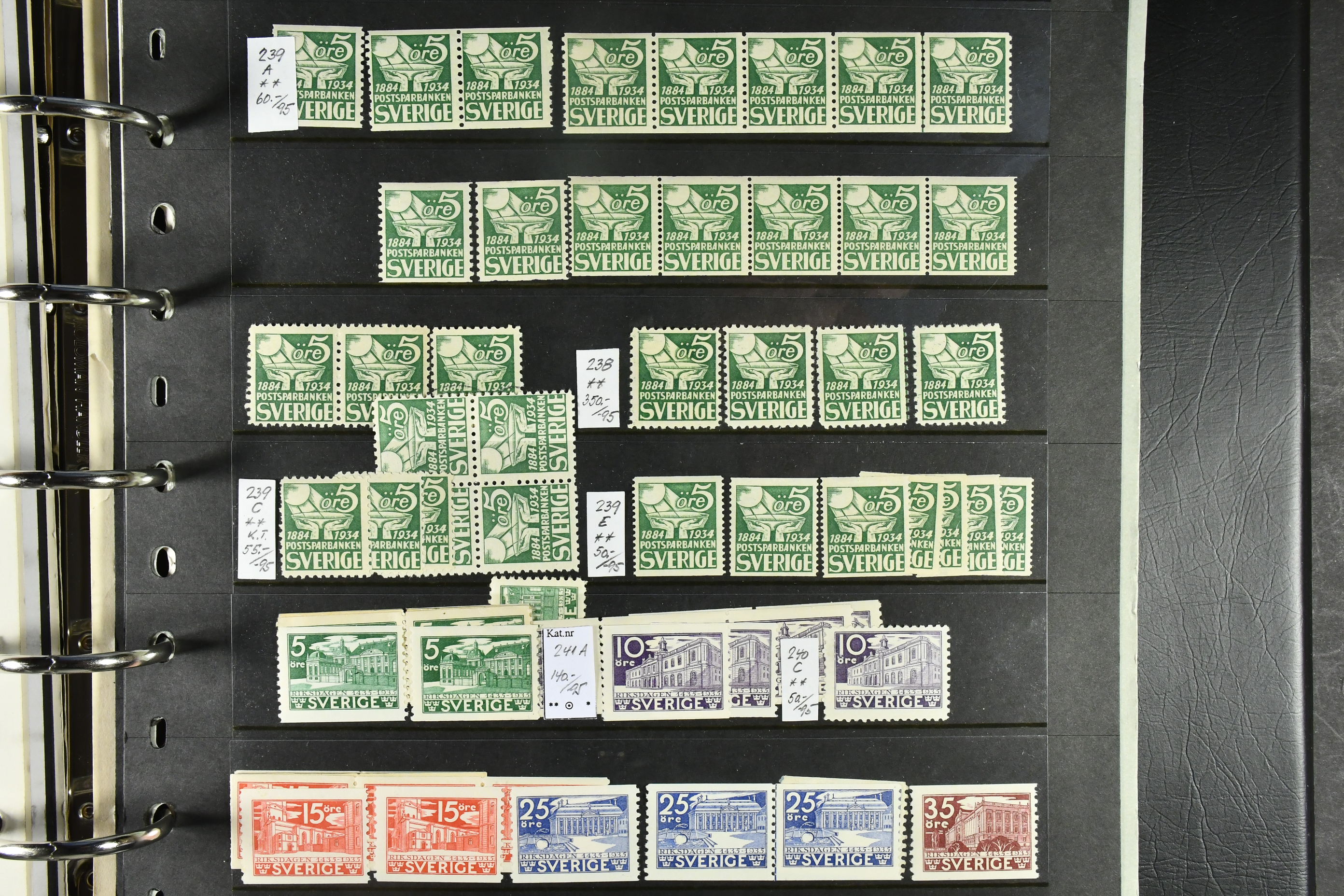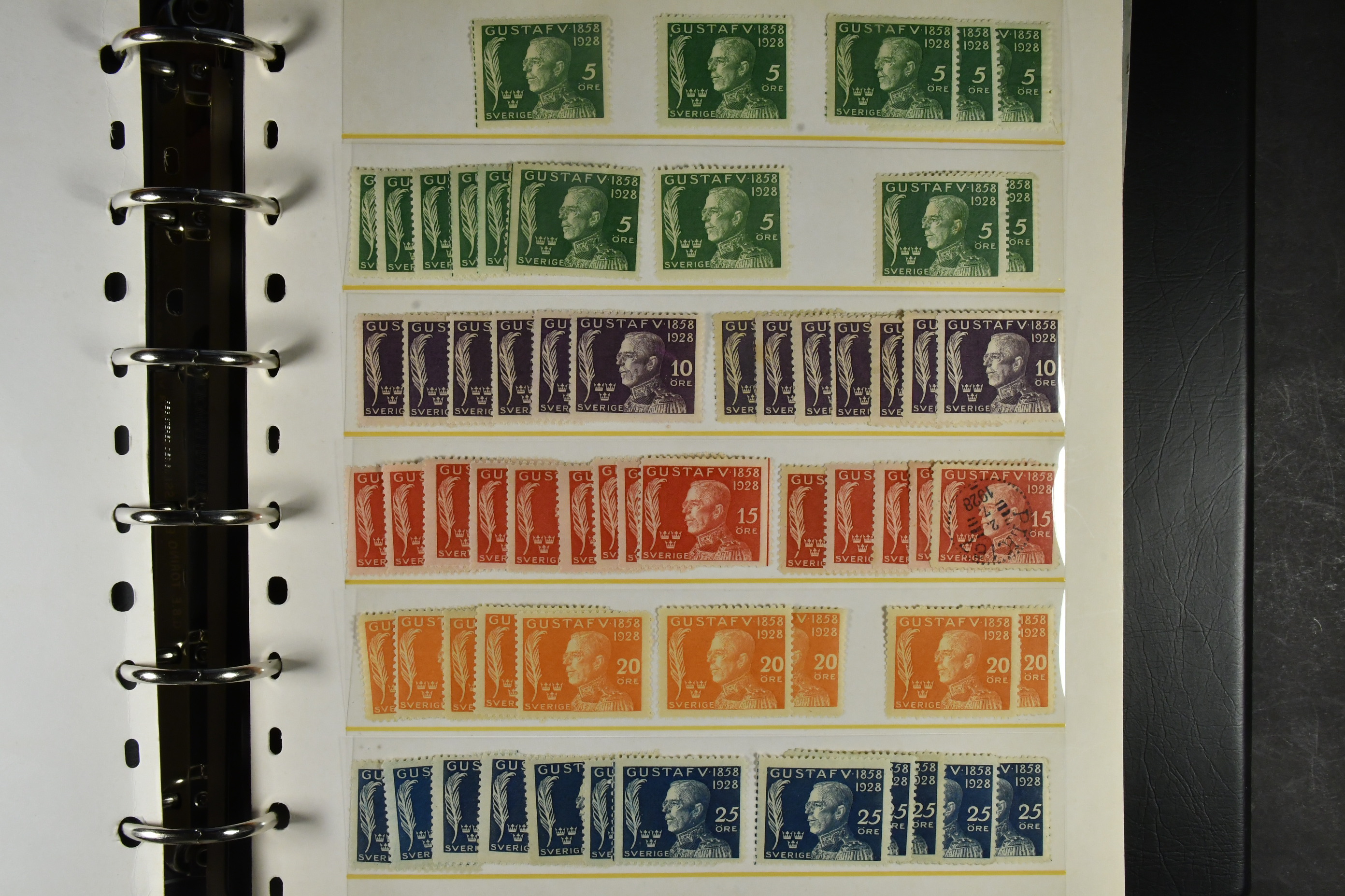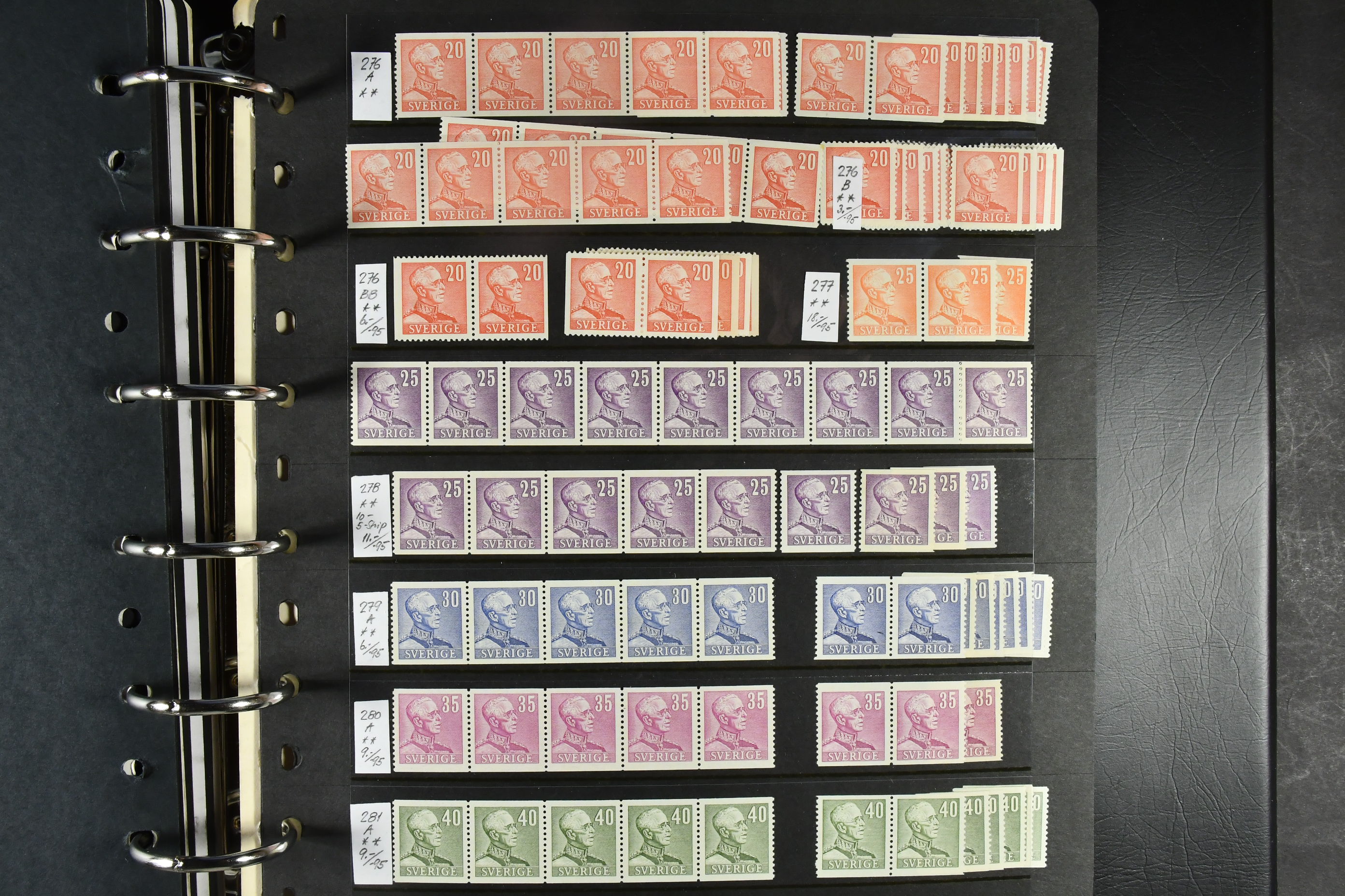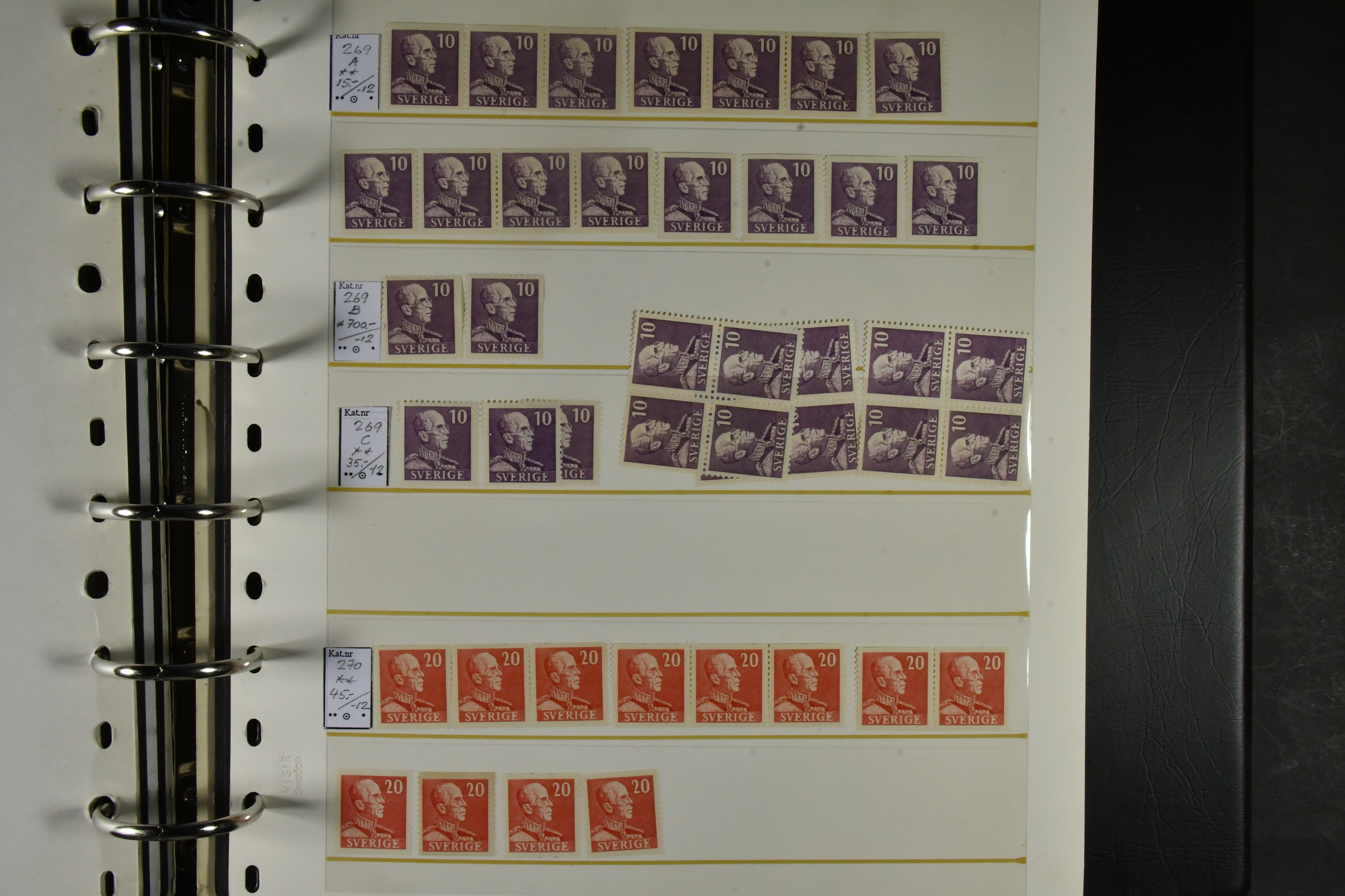 Sweden. Accumulation mostly ★★ 1928–1949 in visir album. Stock material, starting with King Gustaf V 70 years and ending with King Gustaf V regular issue (1939–49). A few older and/or cancelled stamps, plus one booklet are also included. Fine quality. (>500)